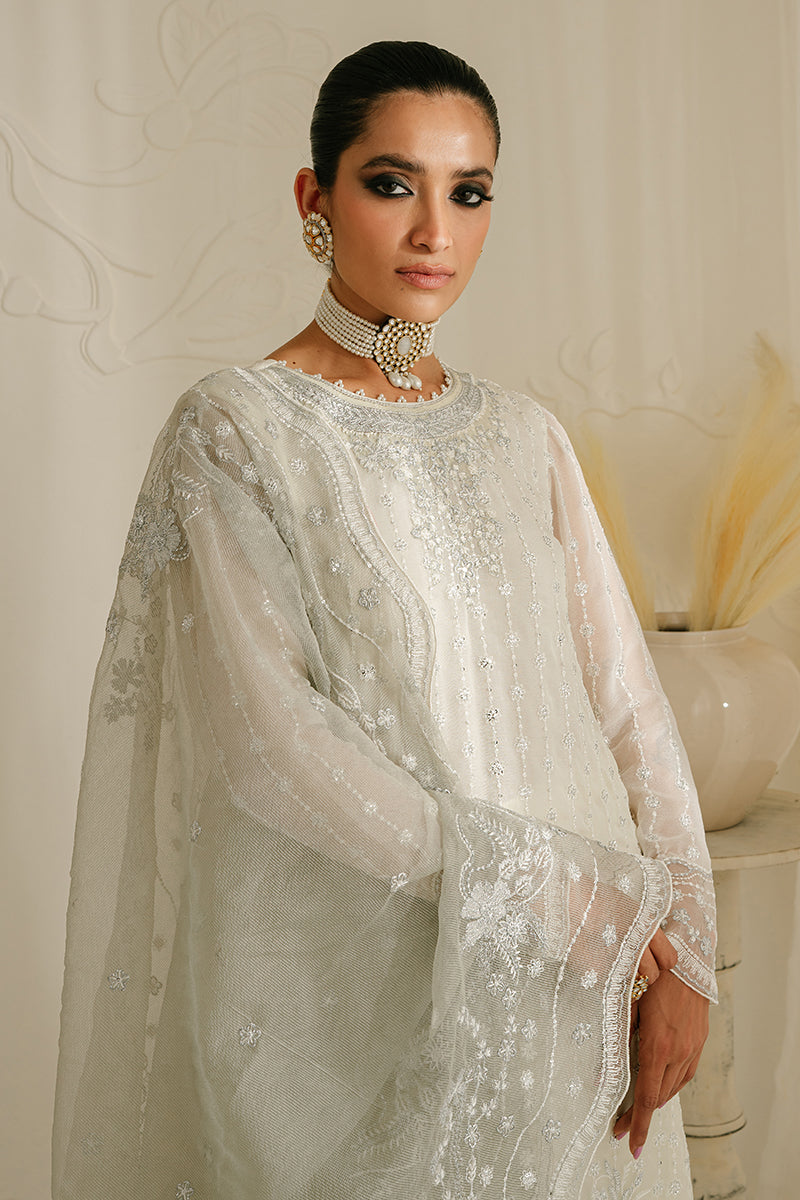 Look sharp and stylish in the Pristine Grizzled Shirt. Crafted from Chiffon, this elegant design features embroidered trim on the front, back, and sleeves. The shirt also comes with a dyed silk slip and trousers, along with a net embroidered dupatta for the complete look. With 40" and 80" embroidered patti for the front and back hem and sleeves respectively, this stylish ensemble will have you feeling confident and sophisticated.