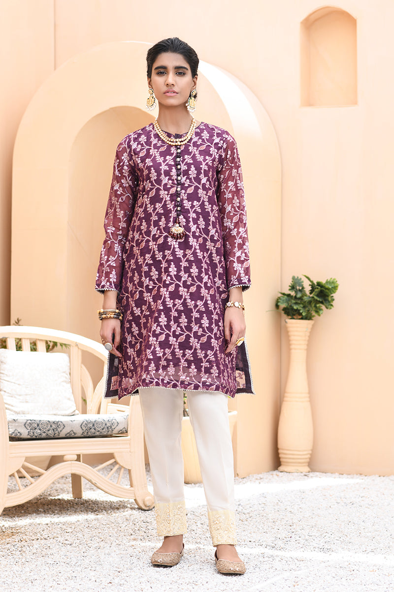 Net Base, Round Neck, Buttons on Front, Full Sleeves, Embellished, Lace Details on Hem and Cuffs