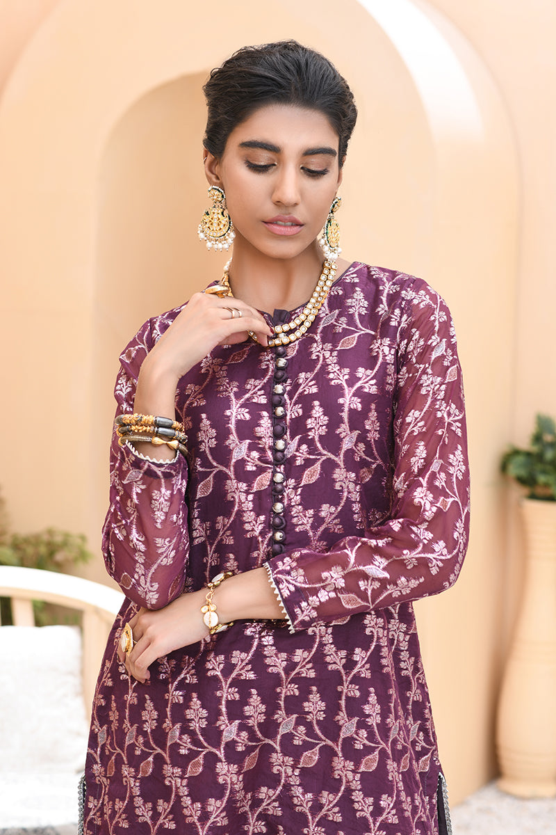 Stand Out in This Unique Gold and Purple Kurta with Contrasting Buttons and Front Embellishments. Style Straight Trousers and Khussas.