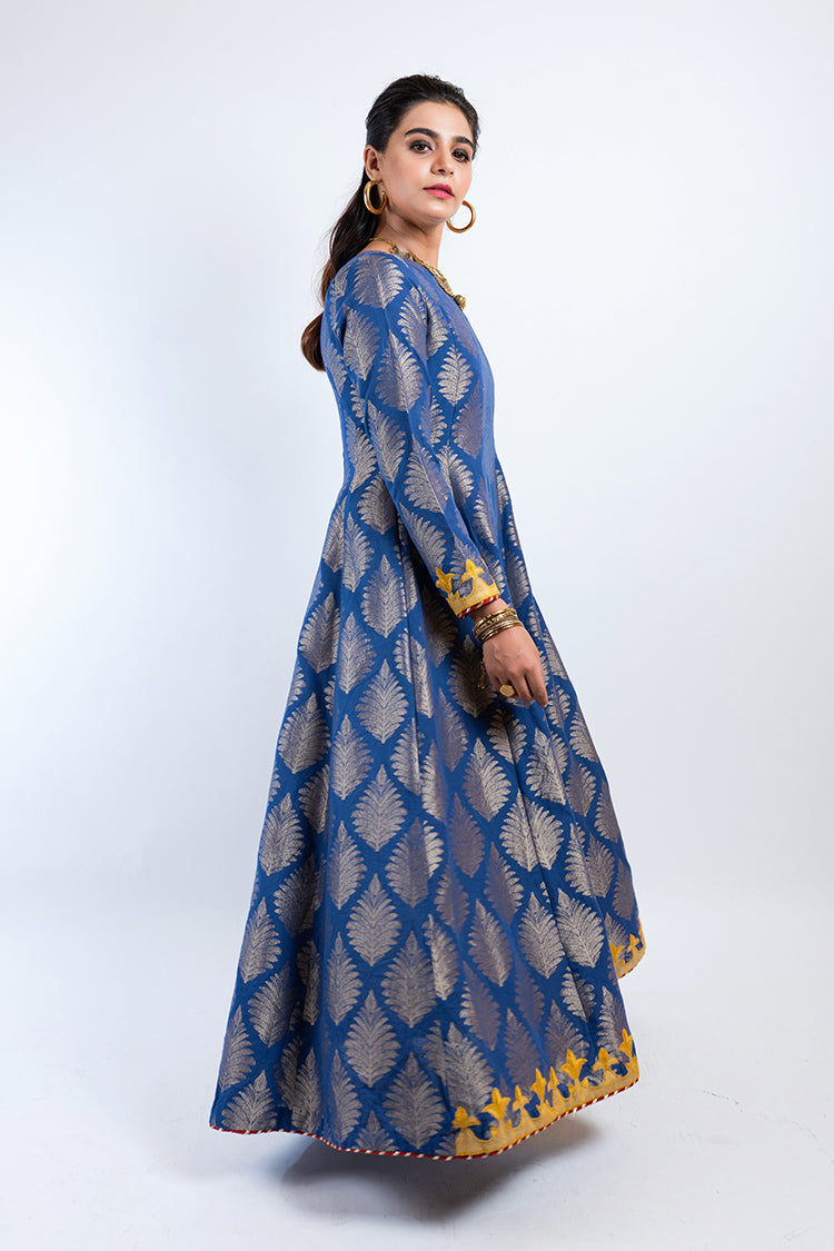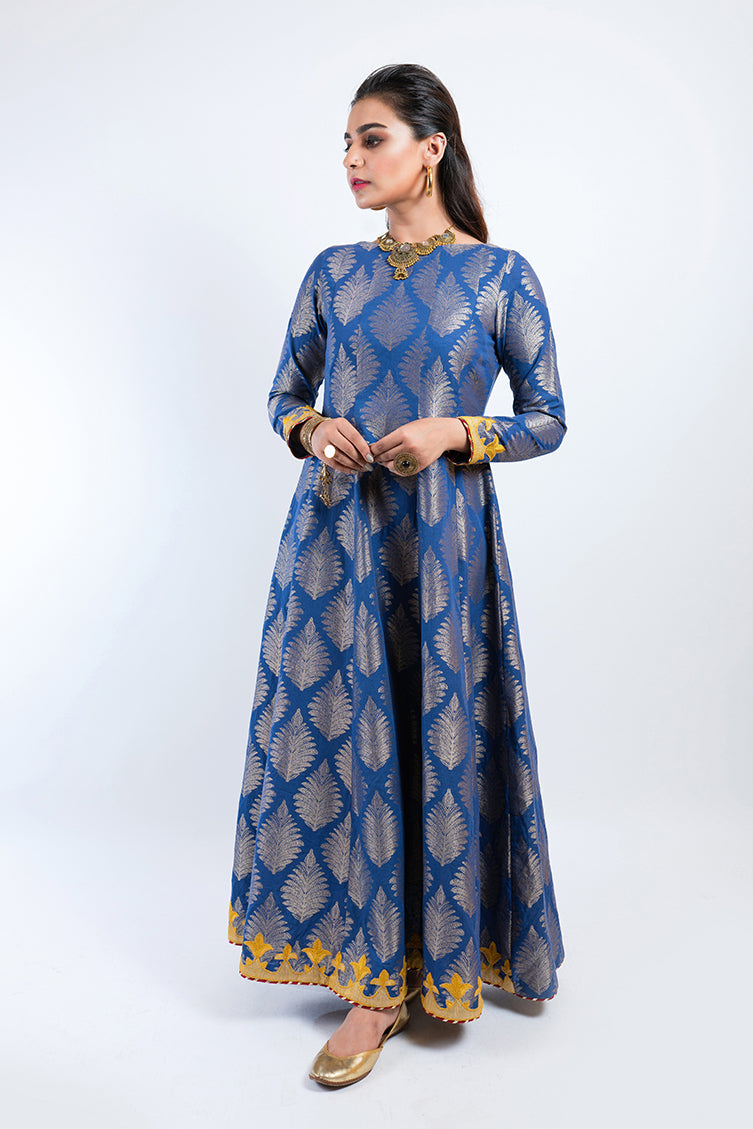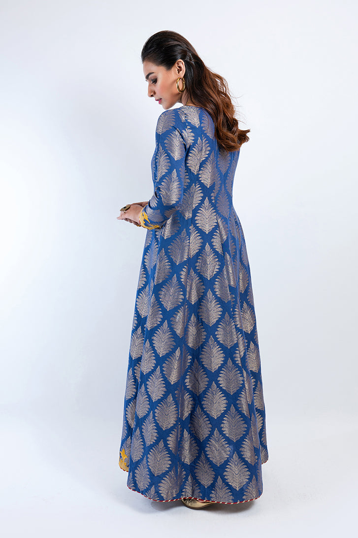 Long jacquard shirt with a sleek gown design and leaf design, bordered with a pinch of yellow embroidery. Wear it formally with a matching jewelry set.