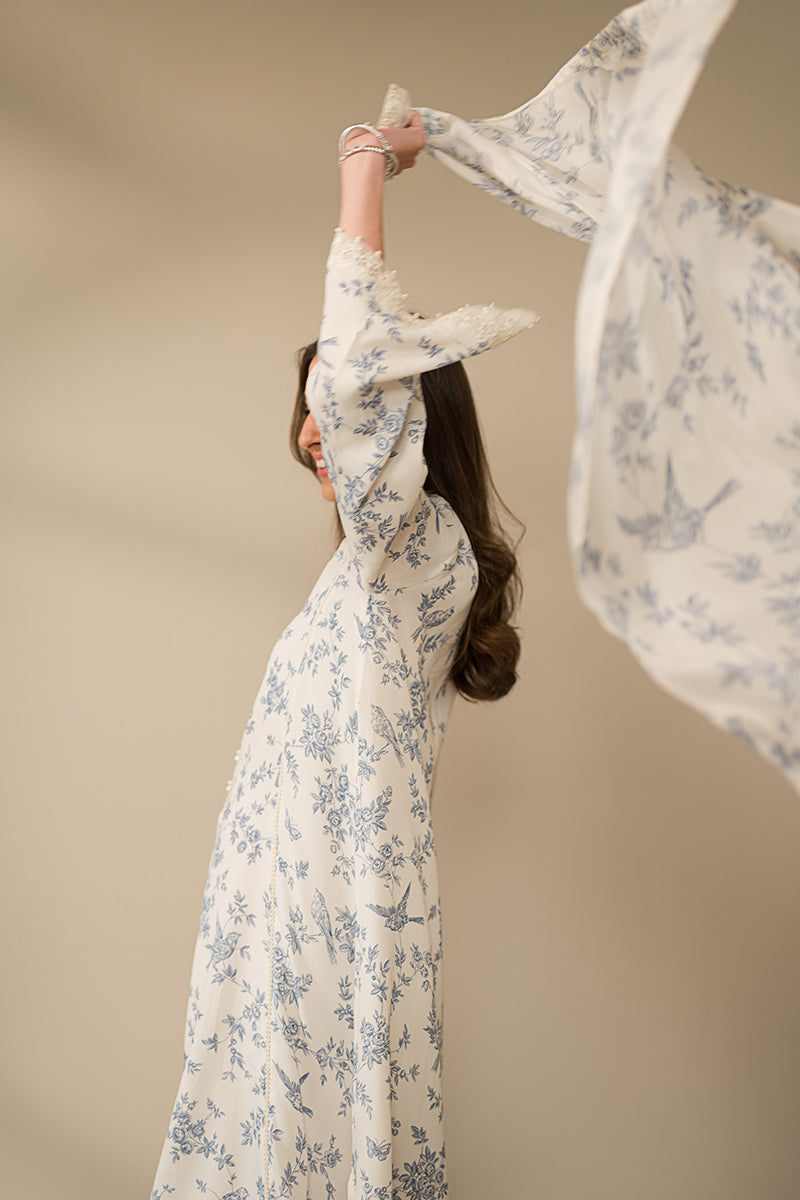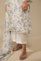 This 2PC set includes a radiant silk shirt and a dupatta, both adorned with intricate printed designs. The flared shirt features side panels and inserted lace, while the back boasts a band collar with embroidery and tasseling detail. Complete the look with the embroidered borders of the dupatta.