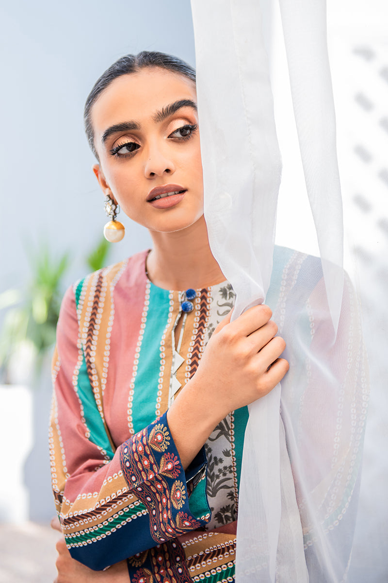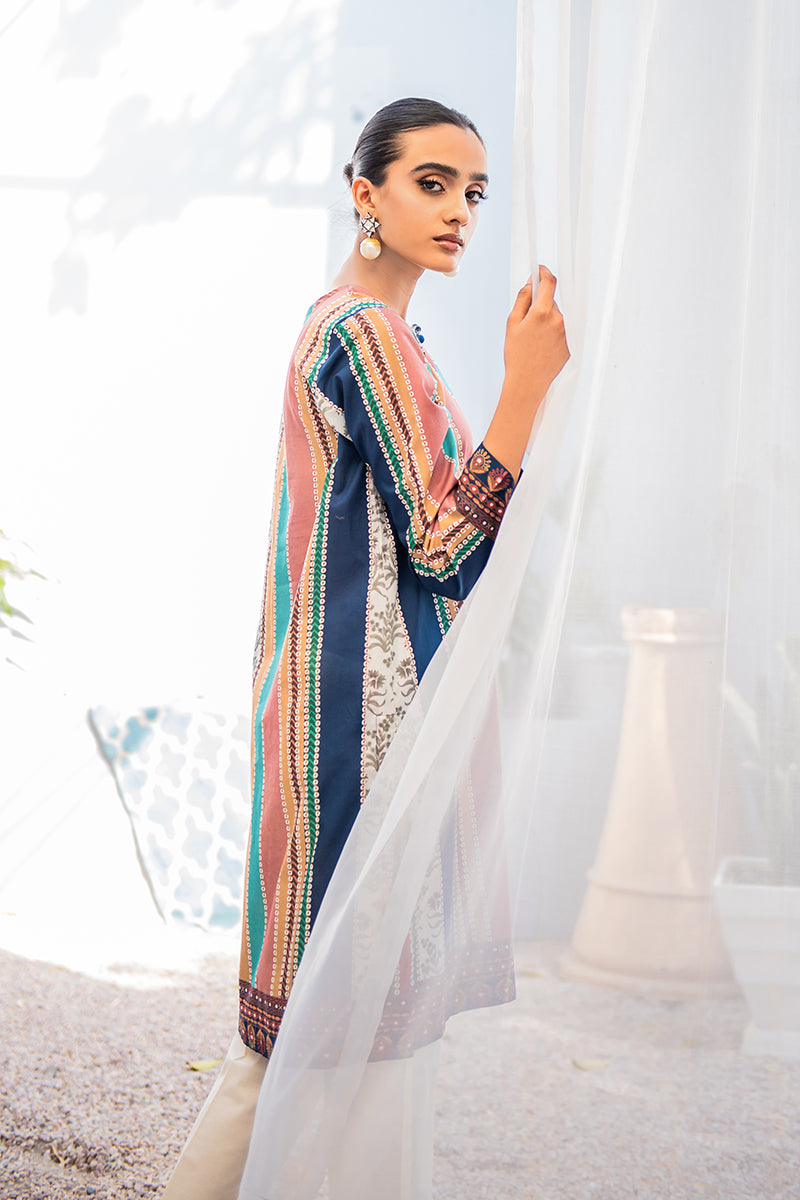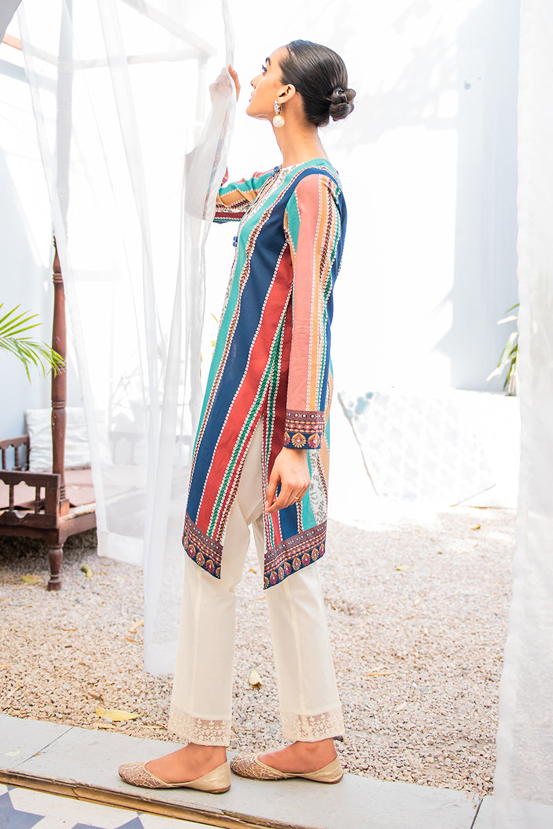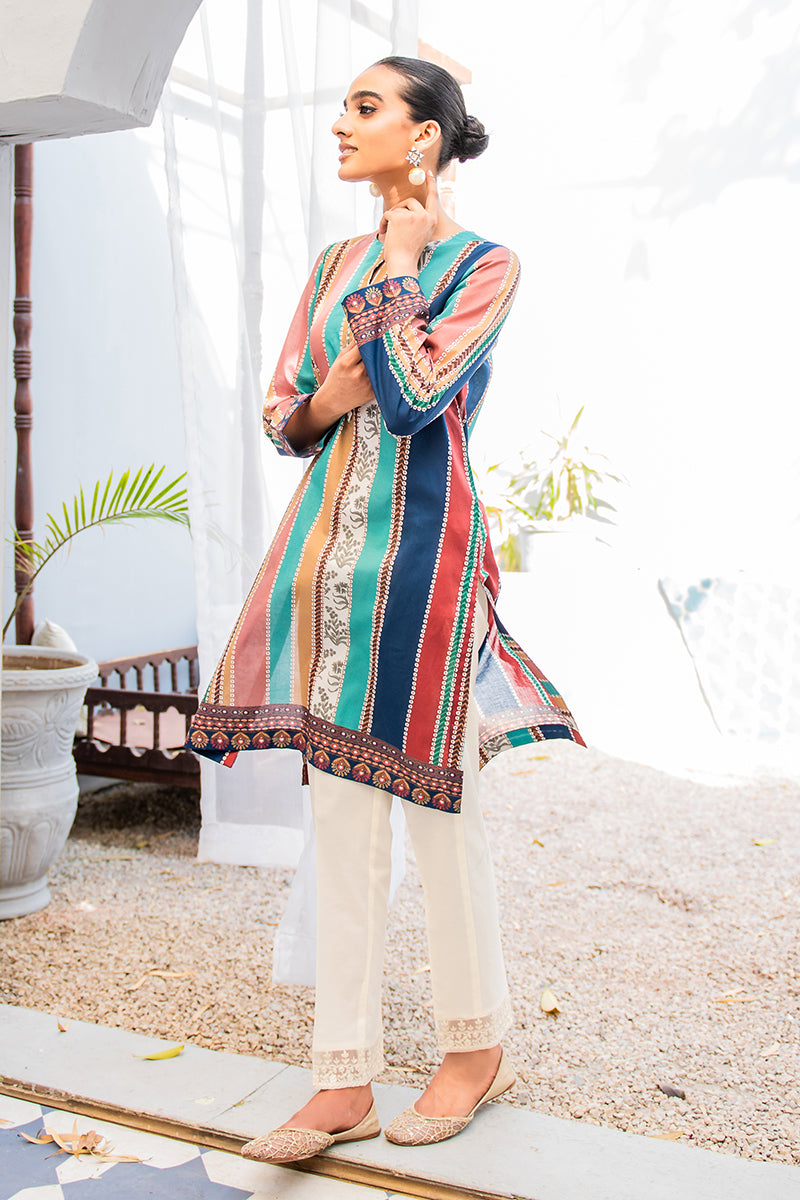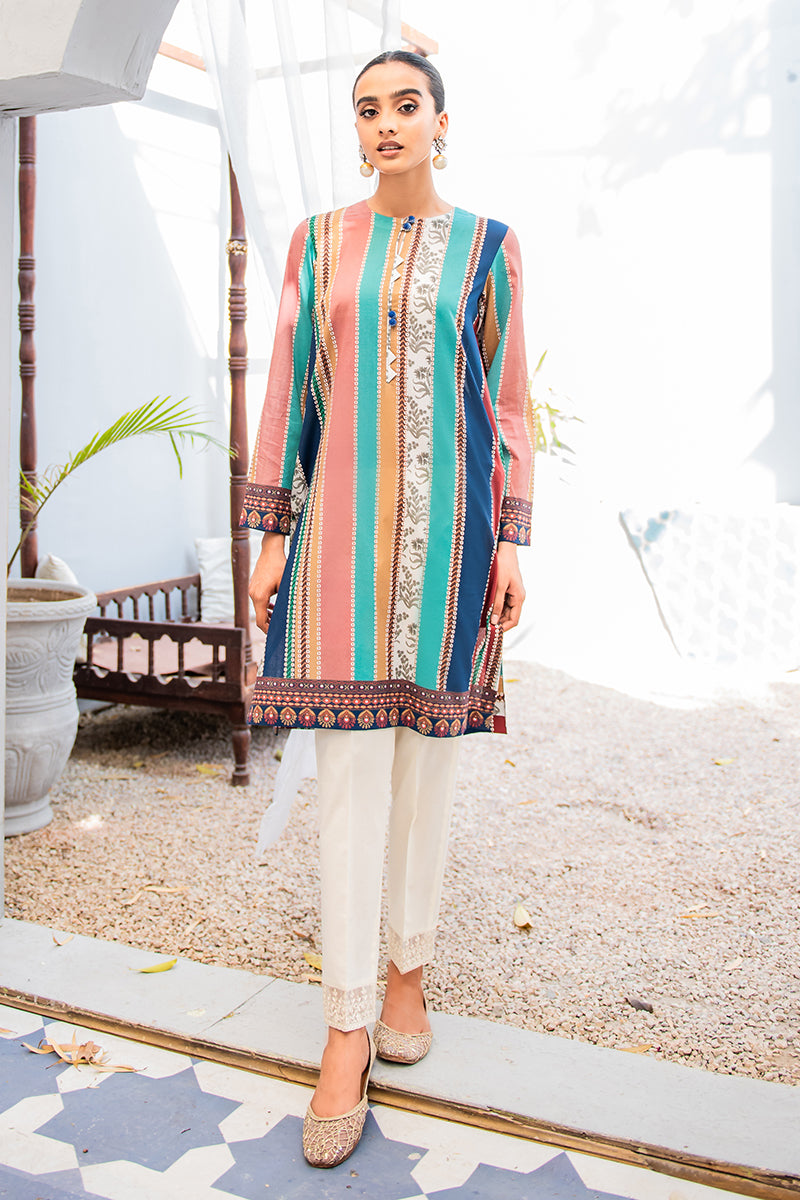 - Radiant Streak features a trendy color blocking digital print rendered on airy lawn fabric featuring a round neckline with loop button details. Pair the chic kurta with plain trousers and chunky studs.