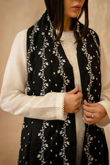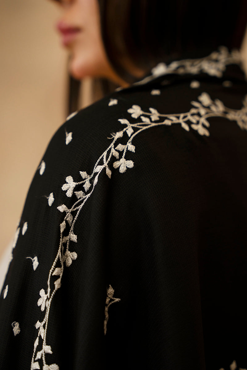 The Raven Embroidered Shawl is crafted from Stapple Woolen fabric, a quality material renowned for its resilience.