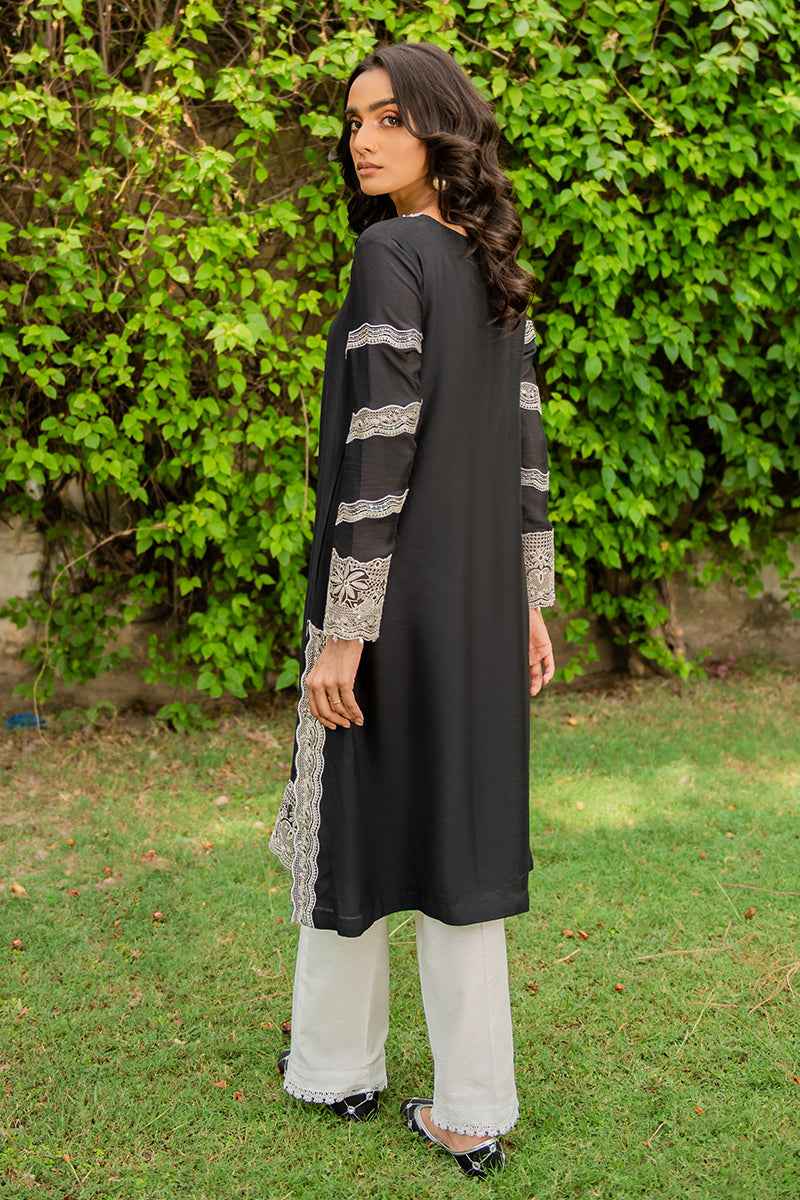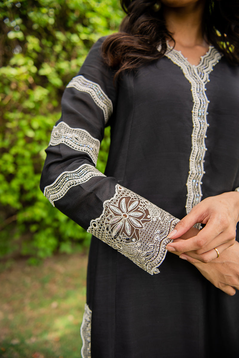 - Raven Lace stands tall as an A-line paneled shirt with front embroidered border and side slits featuring a pearl embellished neckline. Pair with wide legged trousers and blowout hair to give yourself a contemporary attire.