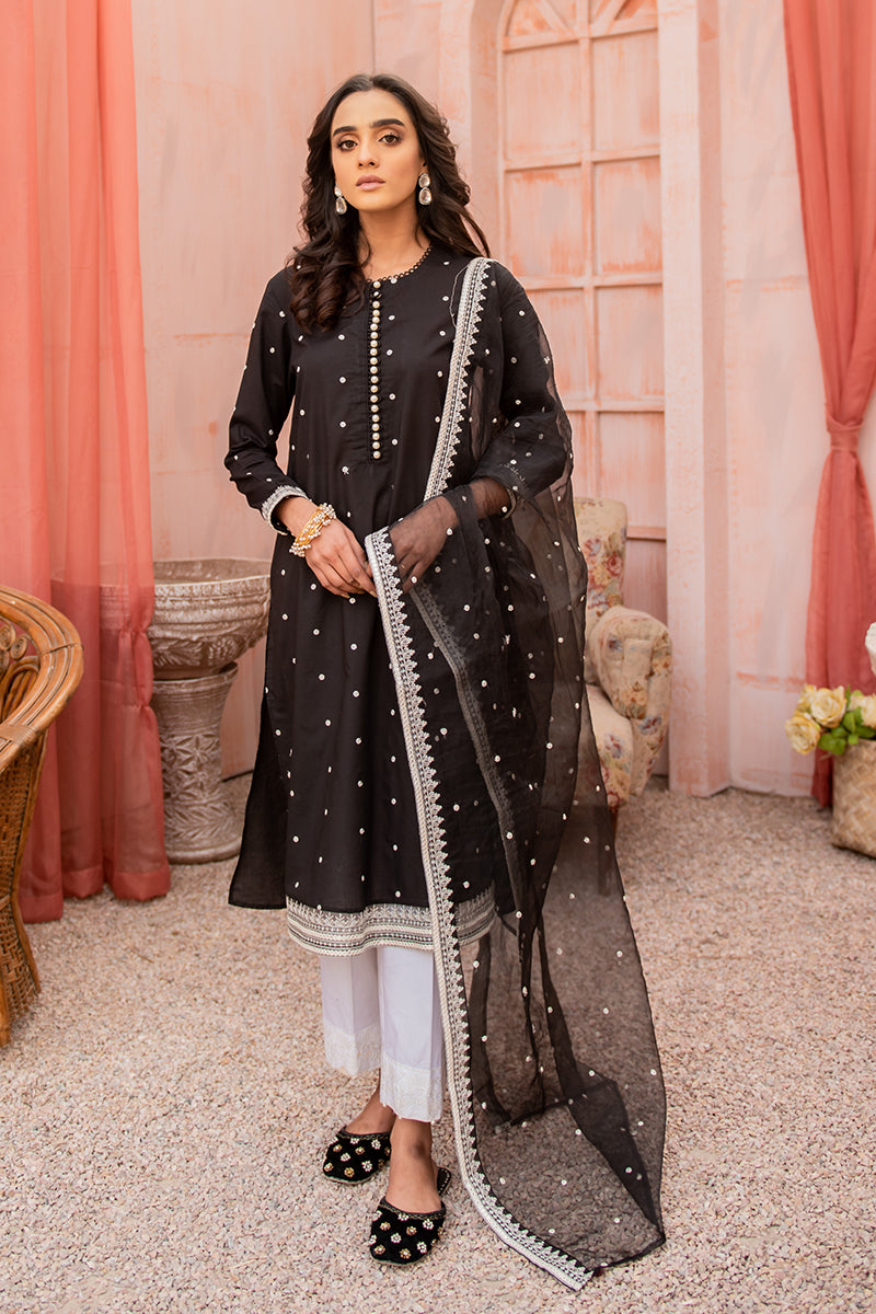 - Intricately embroidered lawn shirt with faux mirror embroidered borders. Paired with black kurta is an embroidered organza dupatta embellished with faux mirror details. Style the two piece with loose curls and contoured makeup.