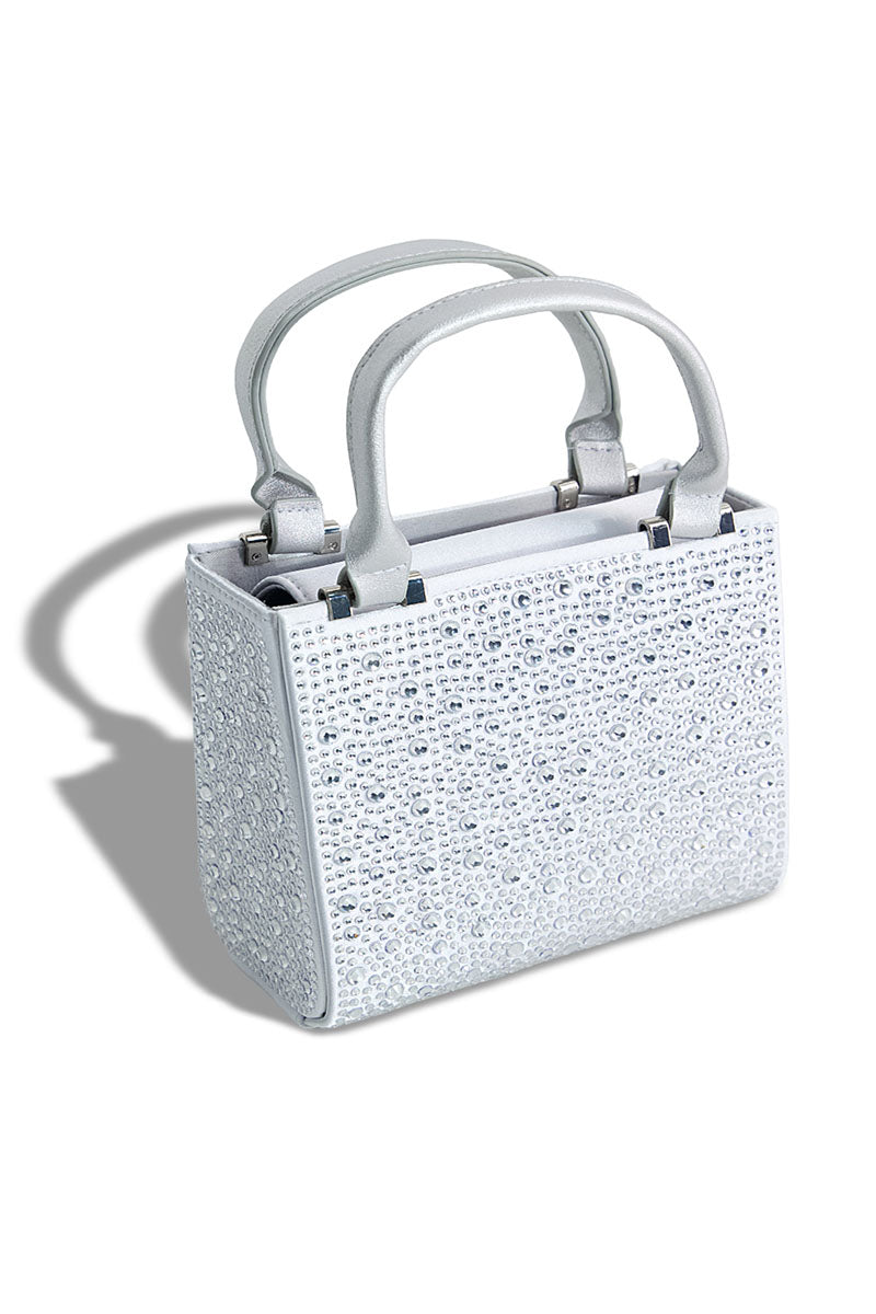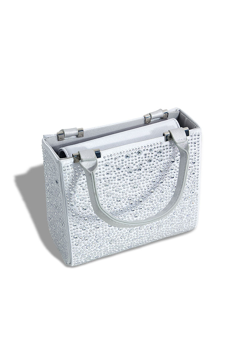 Silver embellished handbag with dimensions of 5.7" height and 6.7" width. A sophisticated accessory designed for refined taste.