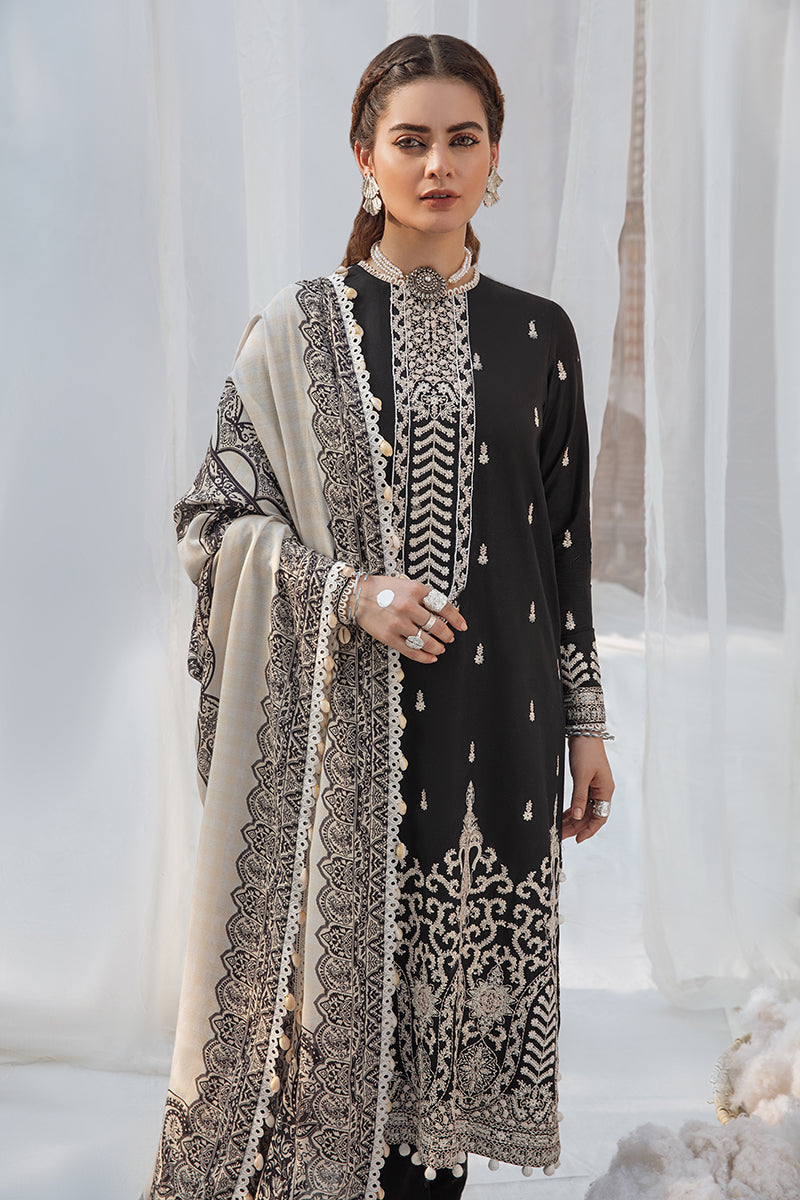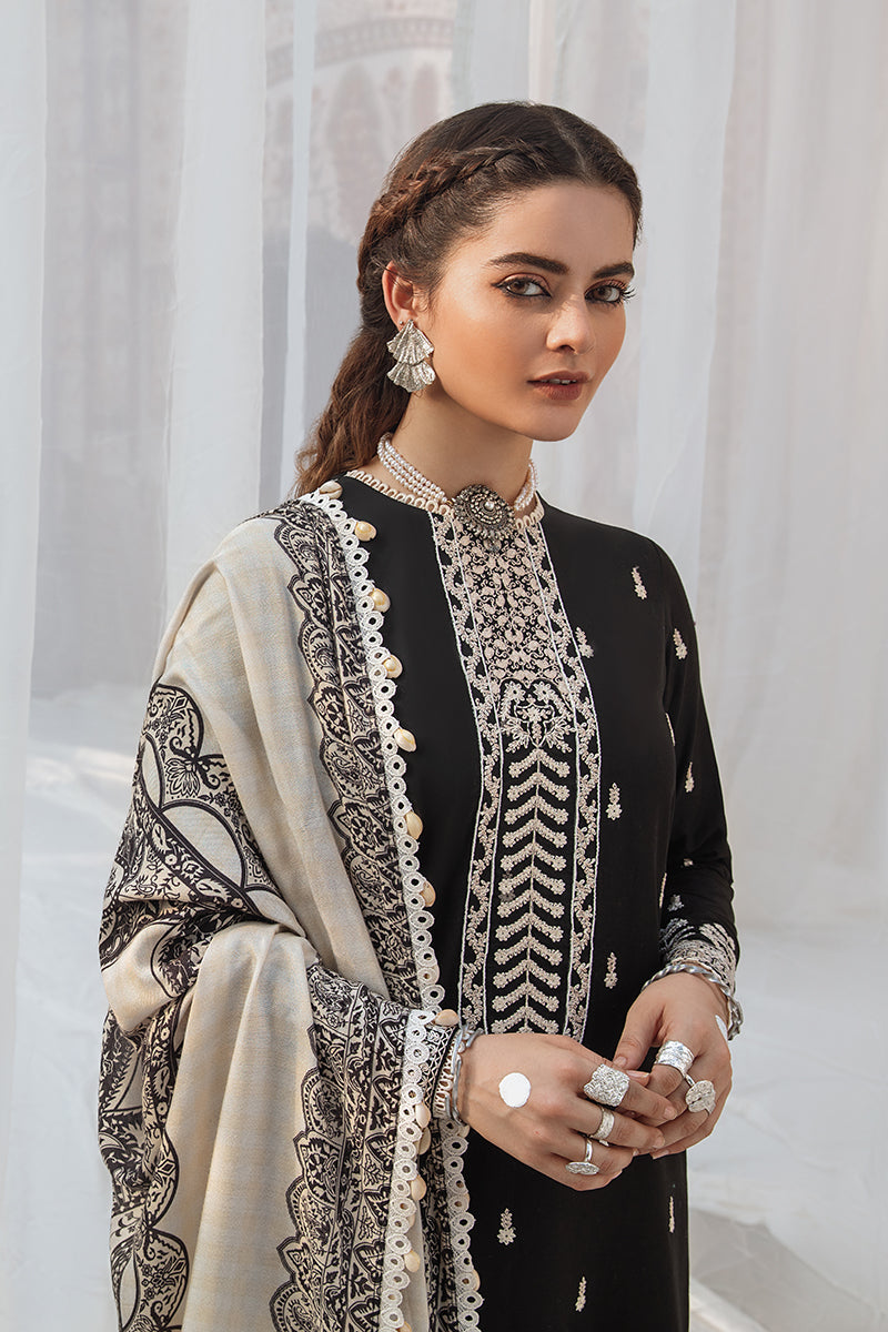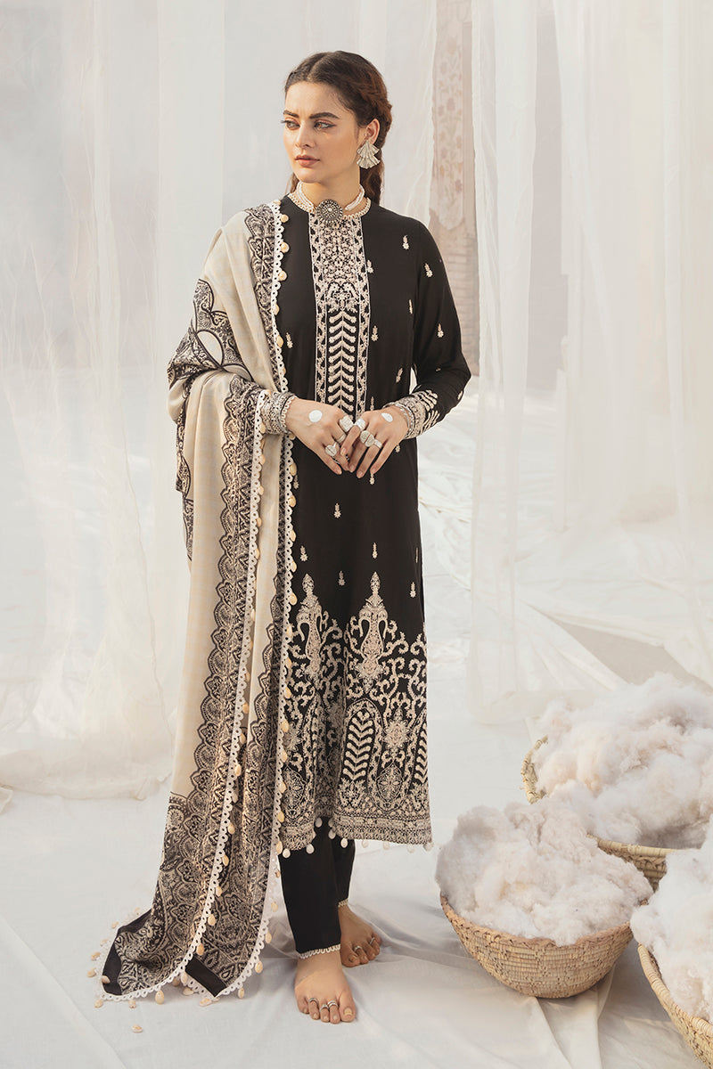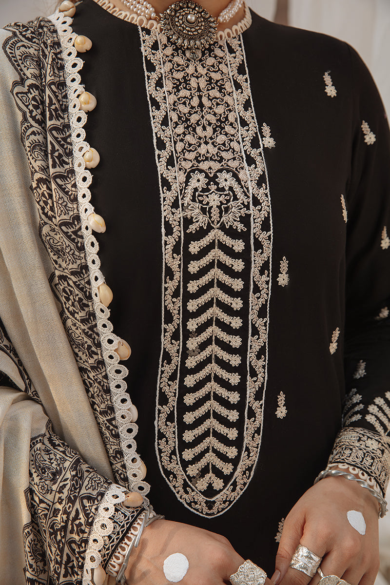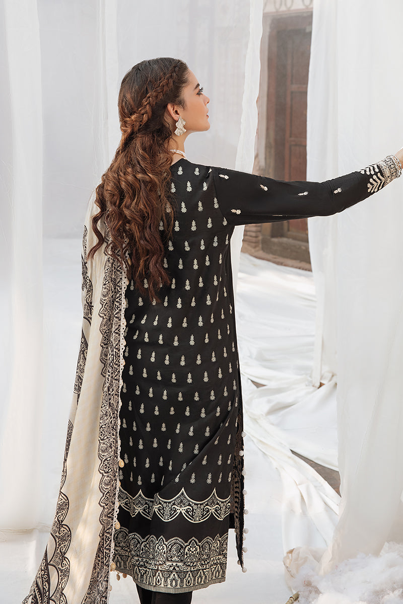 MAKE A STARRY ENTRANCE IN THIS PICTURE-PERFECT MONOCHROME OUTFIT WITH BLACK SATIN CANVAS WITH INTRICATE WHITE EMBROIDERIES ON THE NECKLINE AND BORDERS.
