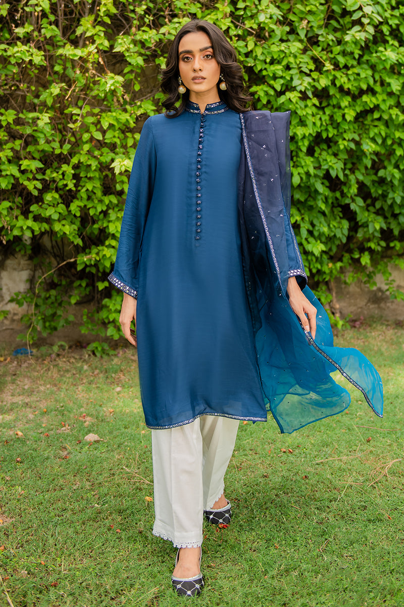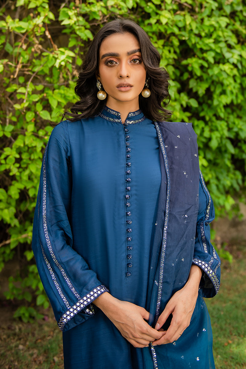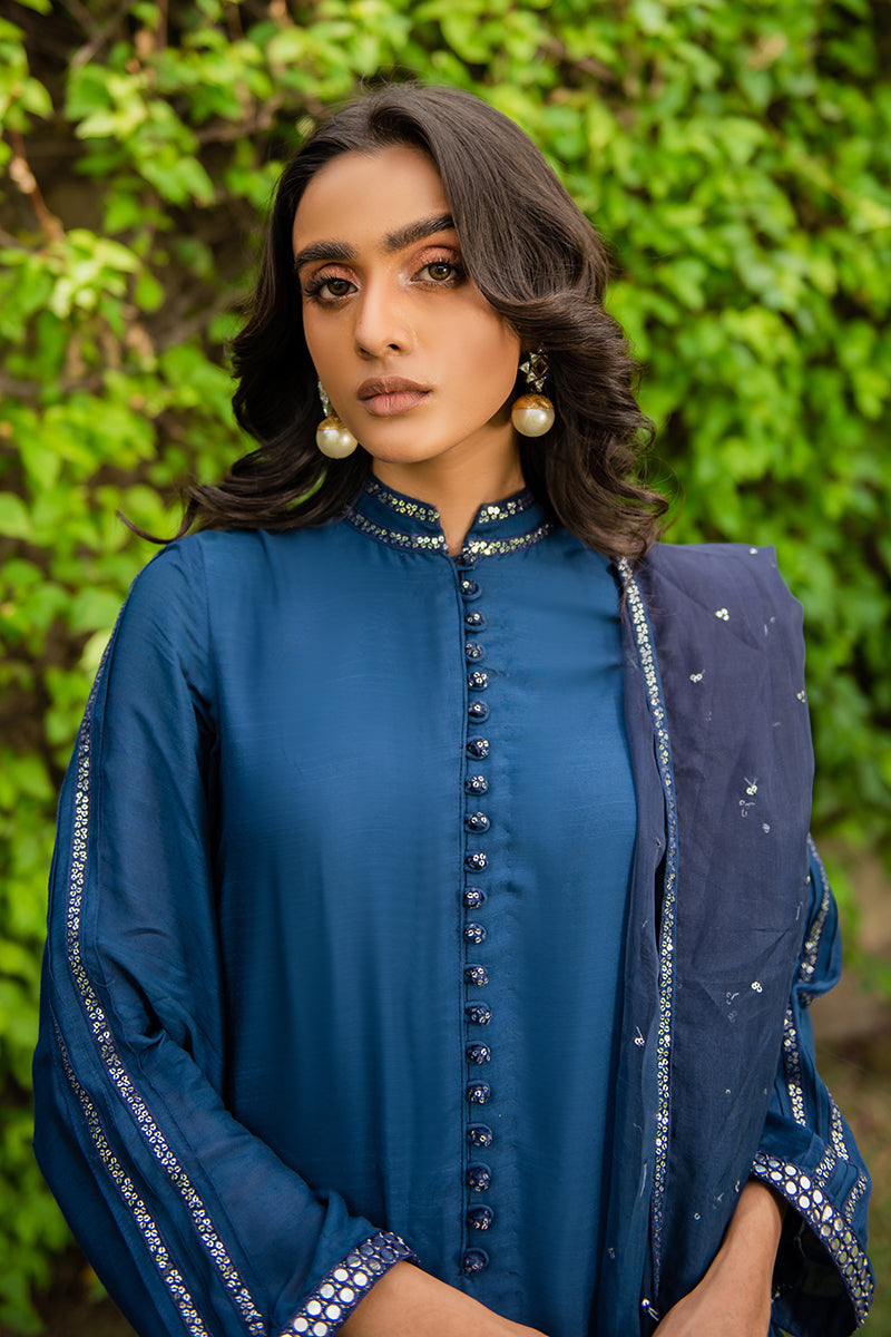 - Simple, minimal and subtle, Renate is a chic monochrome two piece in a midnight blue color. The raw silk attire has faux mirror embellishments with pleats on the sleeves elevated by a gorgeous two-toned organza dupatta with sequin spray details.