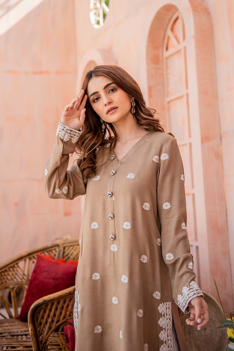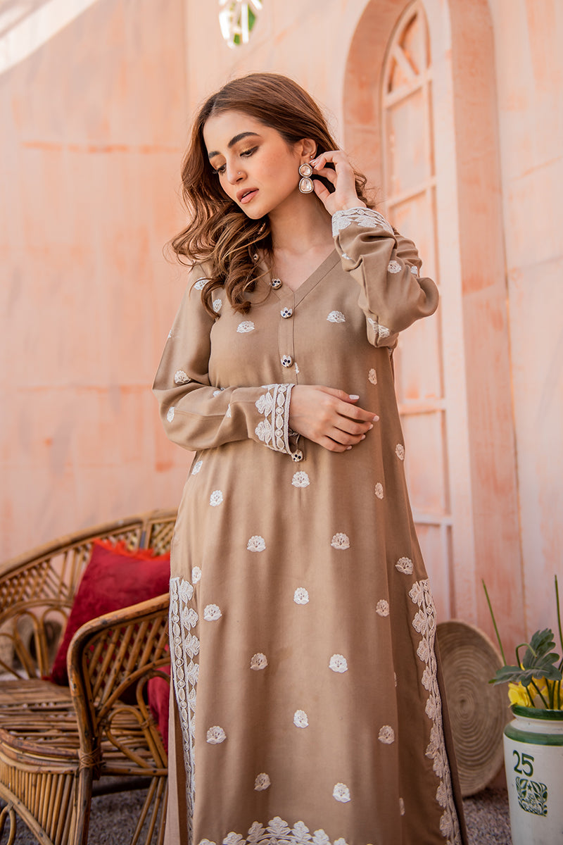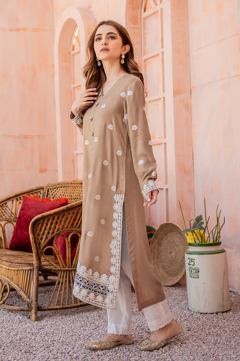 - Resham Features a Fully Embroidered A-Line Shirt with Dori Embroidered Details and Embroidered Buttons on Neckline. The Warm Hued Kurta Pairs Perfectly with a Clean Makeup Look and White Bottoms.