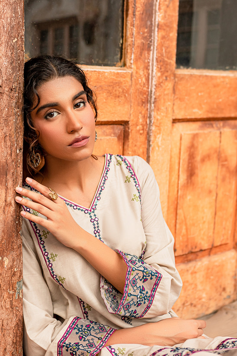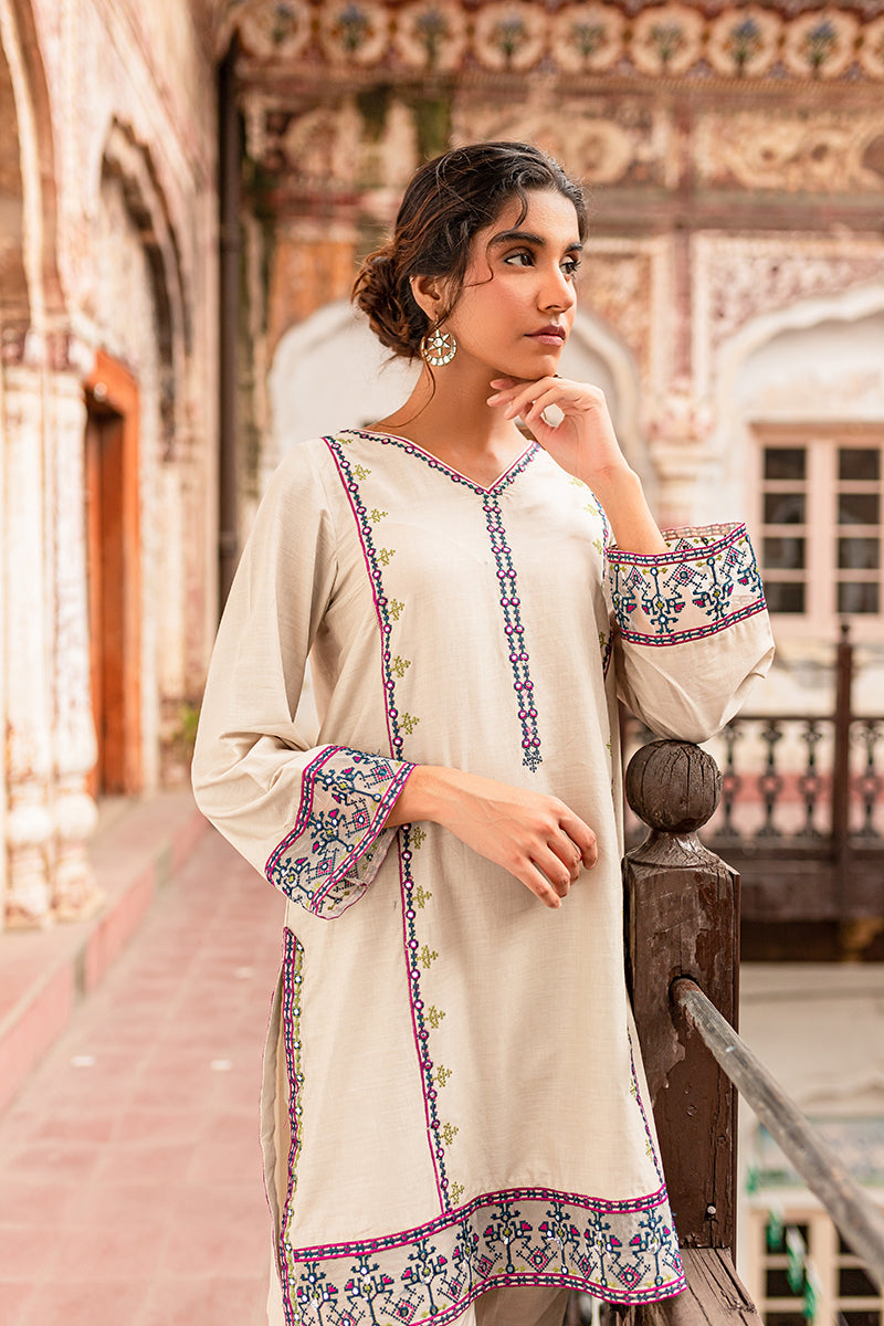 A light brown khaddar kurta traditionally embroidered in the perfect color palette for fall outdoor afternoonsSIZE AND FIT