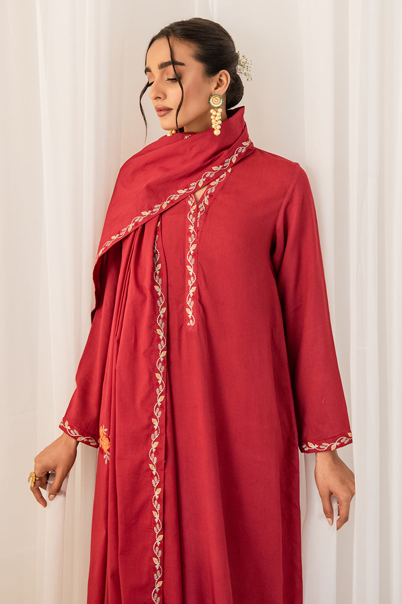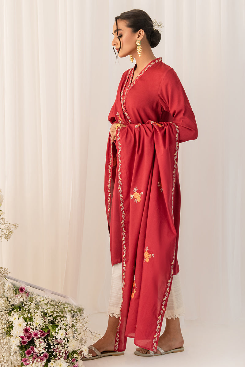 This elegant ROSE WOOD-2PC set is an essential item for your wardrobe. The SHIRT is made of 100% linen and features a wrap-around neckline with intricate embroidery. The sleeves are adorned with embroidered borders. The plain dyed back provides a subtle contrast. The LINEN DUPATTA is perfect for completing the look.