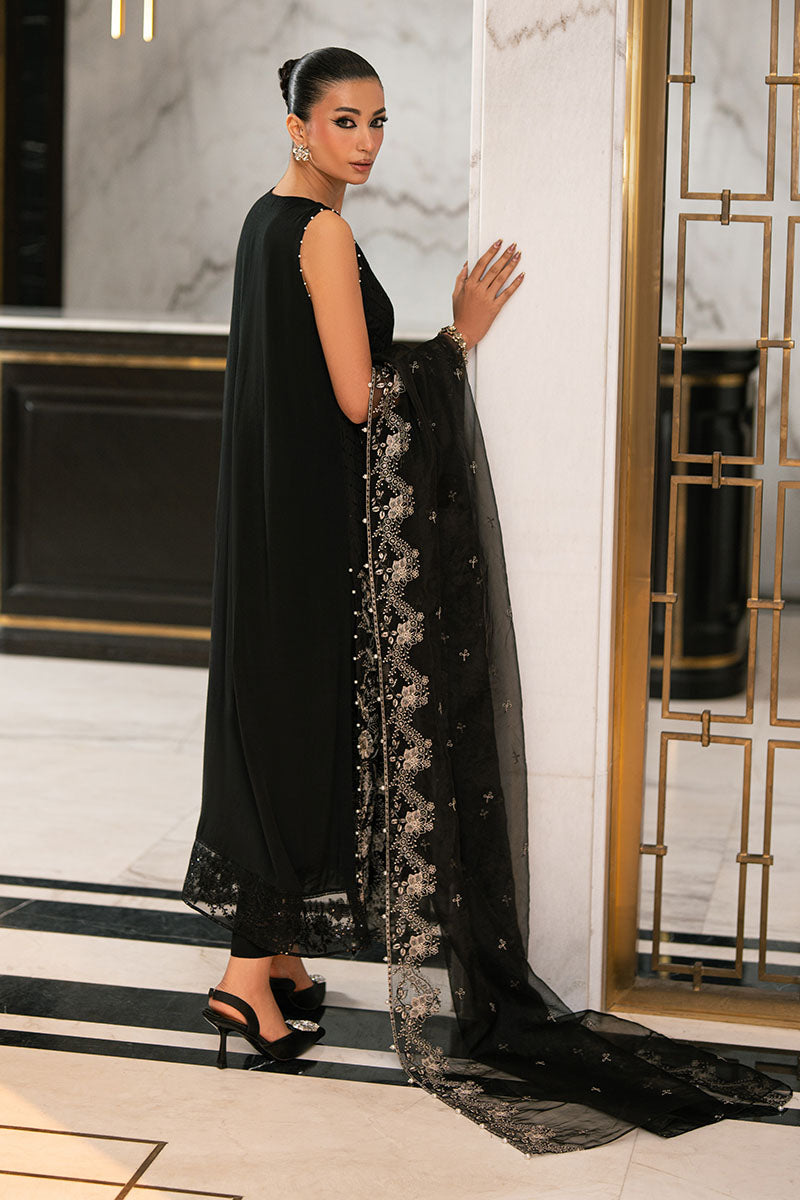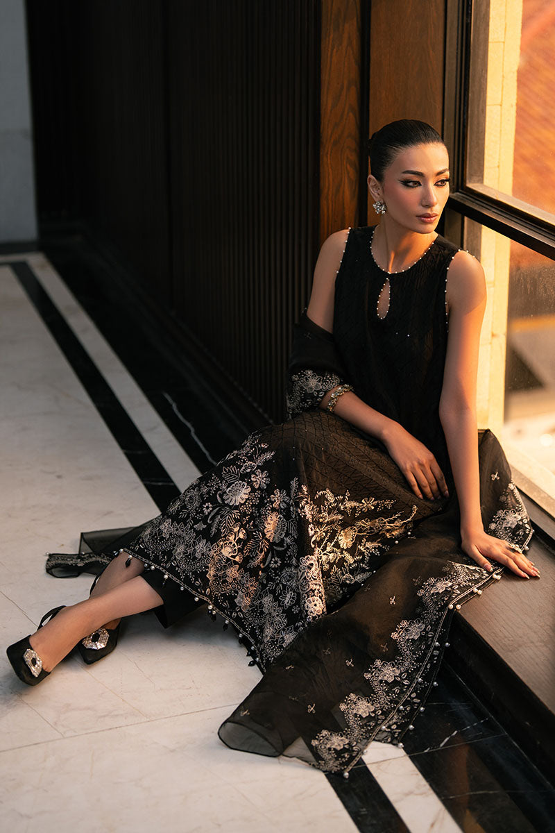 - This CHARCOAL VOID 3-piece suit features a silk embroidered shirt with detailed embroidery on the front and sleeves, complemented by a dyed back and an embroidered patch at the front hem. The back hem and sleeves are enhanced with an 80-inch embroidered patti, adding refined elegance. The silk-dyed trousers offer a smooth, luxurious finish, while the organza dupatta is beautifully embroidered, completing this sophisticated ensemble with expert craftsmanship and timeless style.