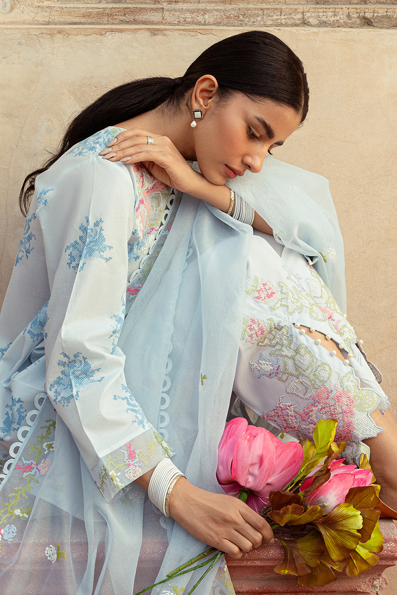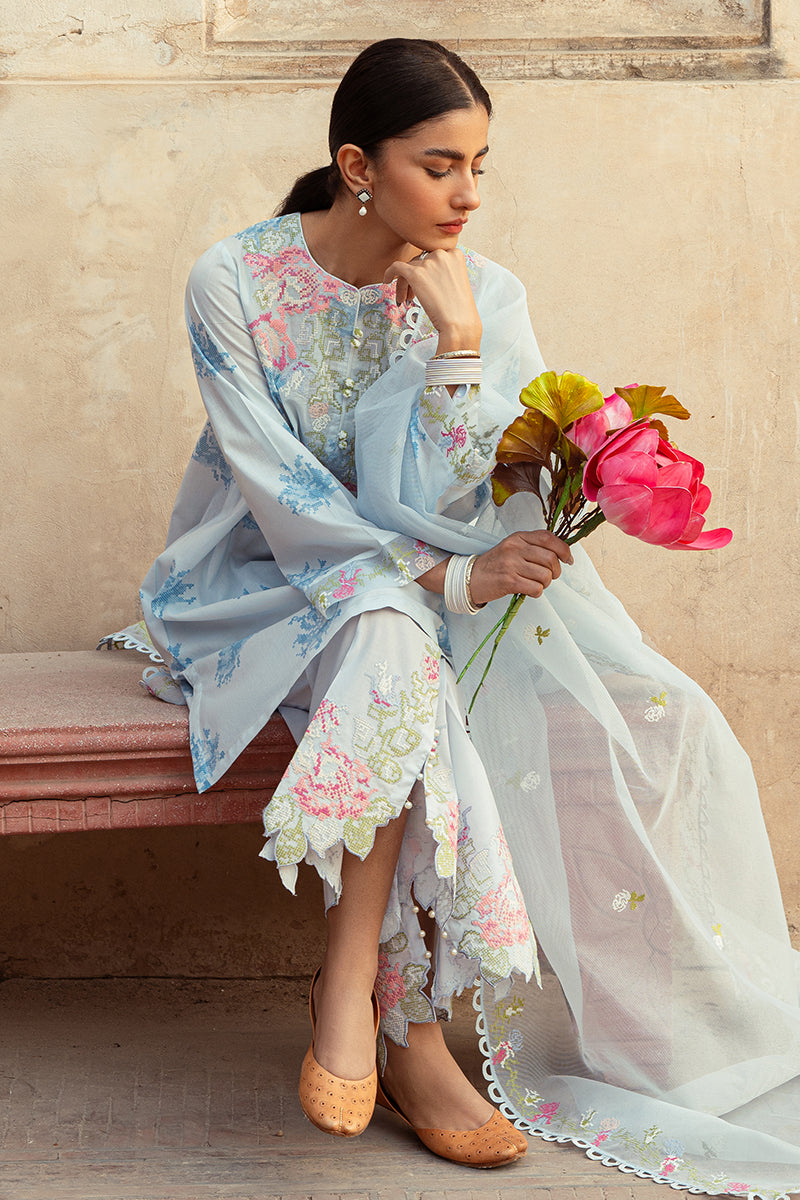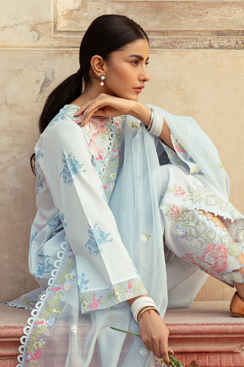 - Discover the perfect combination of comfort and style with our DAWN MIST 3-piece lawn printed suit. This unstitched set includes a shirt with embroidered neckline and beautiful embroidered details, a cambric dyed trouser, and a net embroidered dupatta. Enhance your wardrobe with this elegant ensemble.