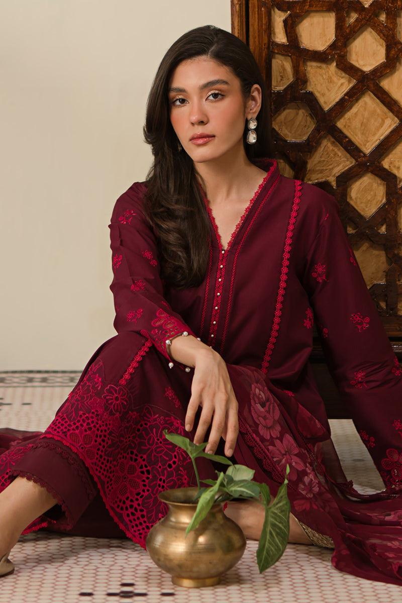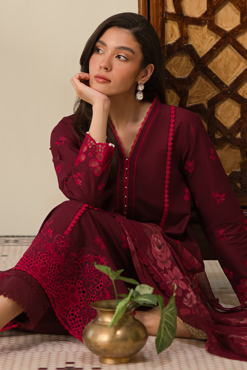 ATTRIBUTE - Expertly crafted with delicate Chikankari embroidery on the front and sleeves, this 3-piece suit features a lawn dyed back for a luxurious touch. The cambric dyed trousers provide a comfortable fit, while the chiffon printed dupatta adds a stylish finishing touch. Elevate your wardrobe with RUBY ROSE.