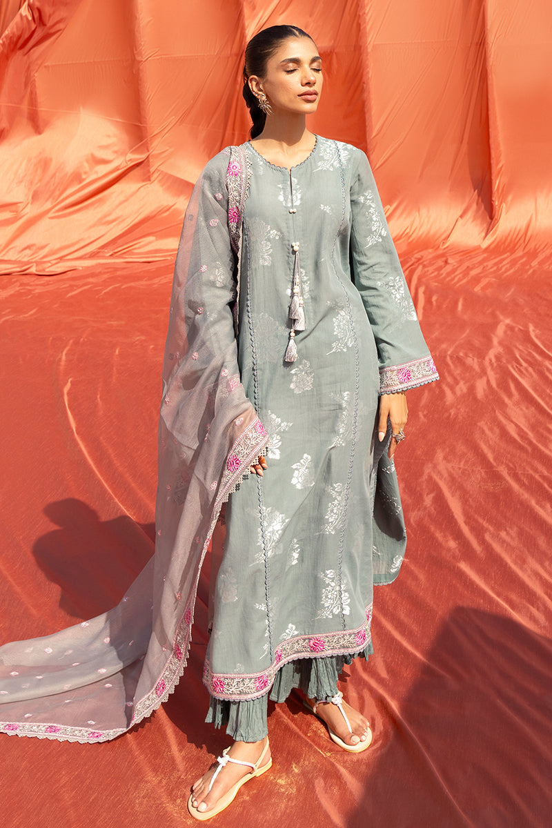 - Expertly crafted from 100% cotton jacquard, this 3-piece suit is guaranteed to add a touch of elegance to your wardrobe. Perfect for any occasion, its intricate embroidered details and net dupatta will make you stand out. Includes a cambric trouser for a complete look.
