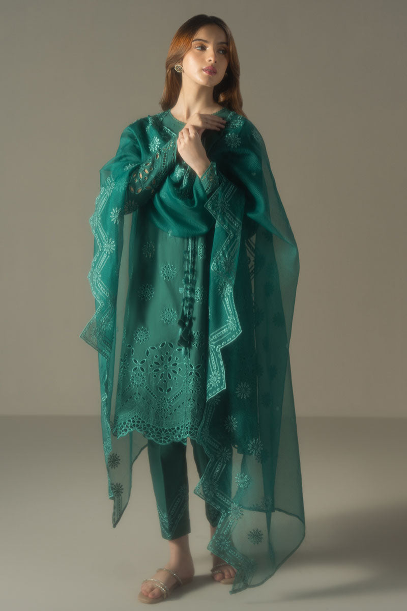 Expertly crafted, the VERDENT FLORA 3PC CHIKANKARI SUIT features chikankari lawn front and sleeves for a touch of elegance. The lawn dyed back adds a subtle contrast. The cambric dyed trouser and 60-inch embroidered patti offer a comfortable fit. Complete the look with the net chikankari dupatta for a sophisticated ensemble.