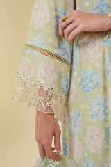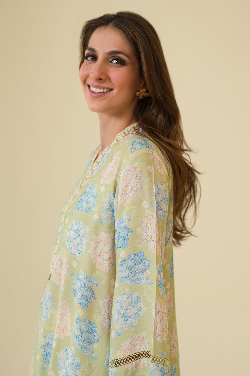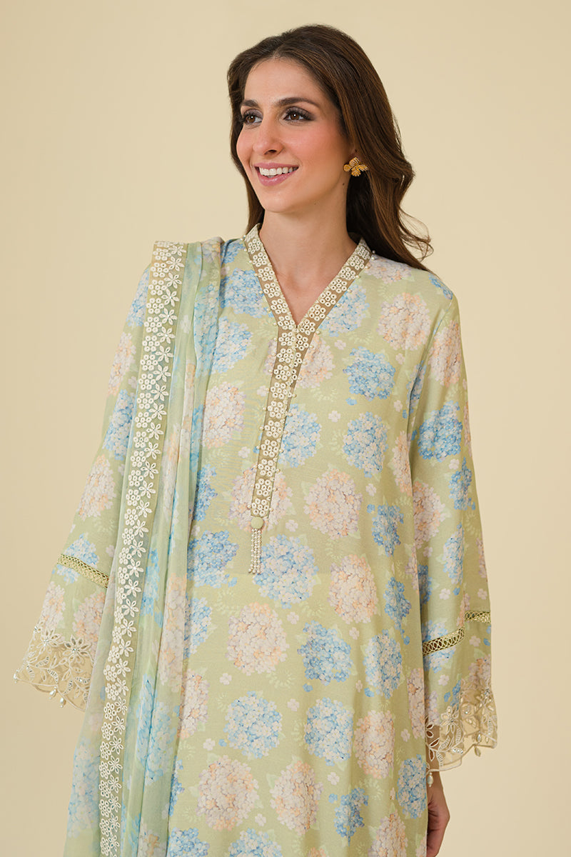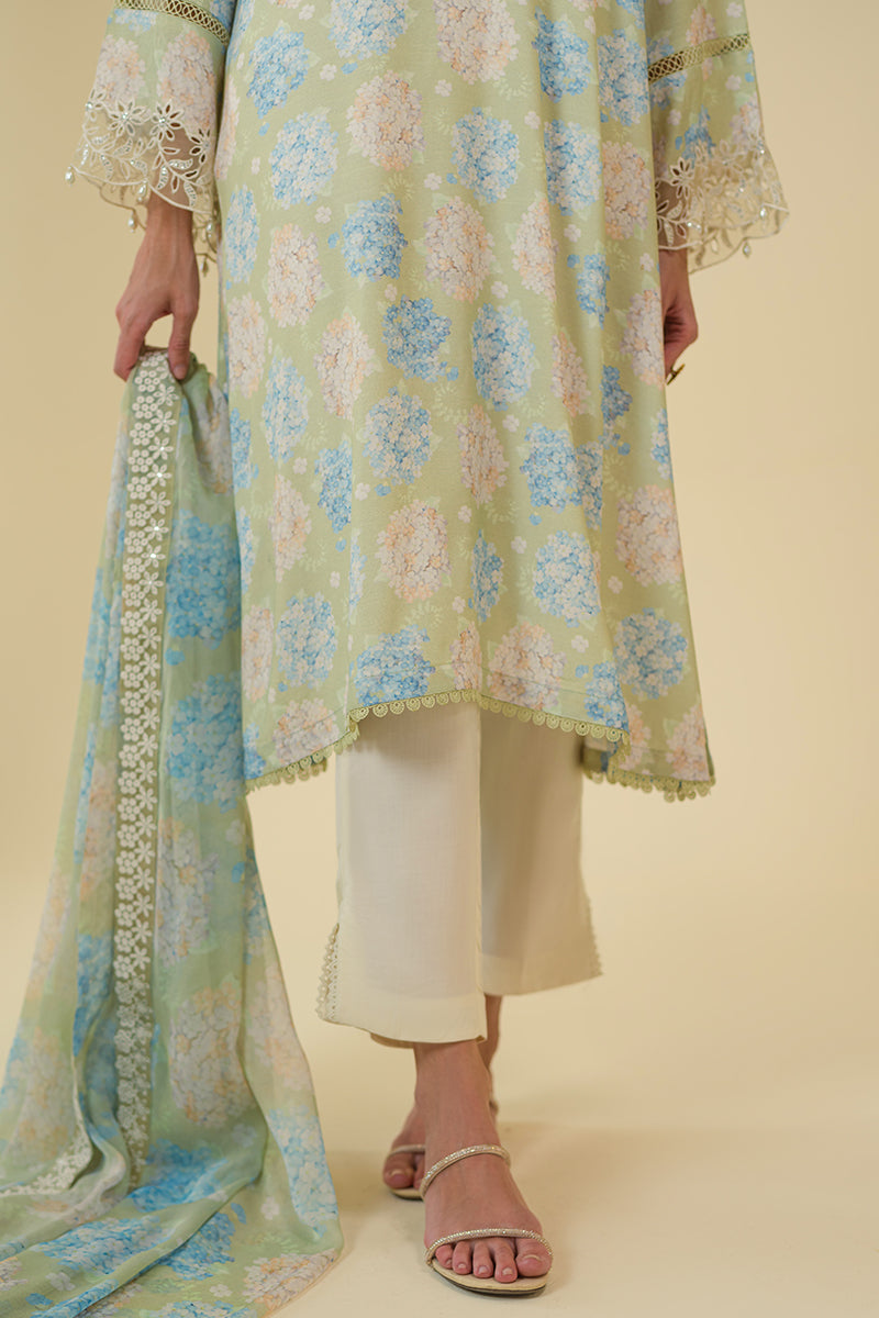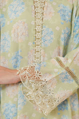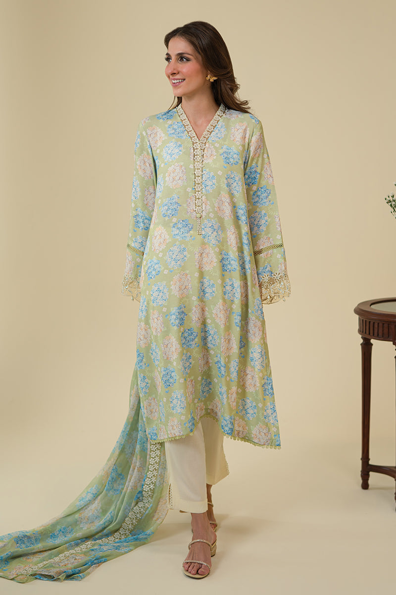 STYLE TIP - The AMBROSIA-2PC set includes a stylish straight silk shirt with a printed lace detail on the front and back. The neckline features embroidery and tasseling, while the flared sleeves are adorned with embroidery and lace. The chiffon dupatta is also printed and embroidered, completing the elegant look.