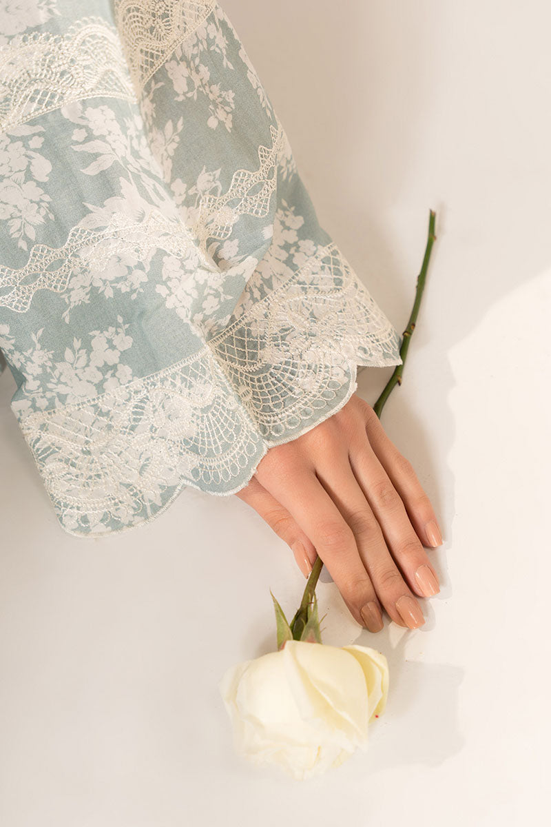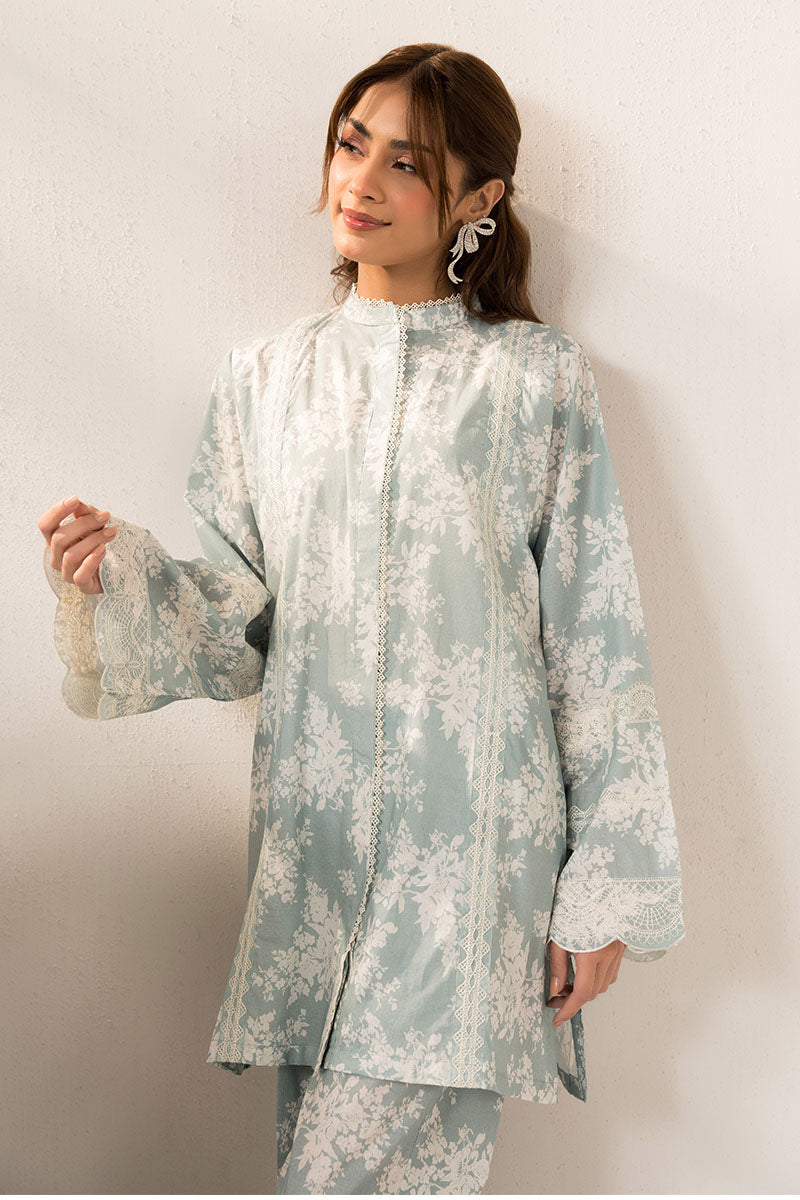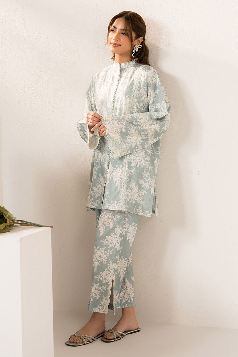 Dress to impress with our AQUATIC MAZE 2-piece set, featuring a stylish front open short shirt with intricate embroidery, a trendy band collar with lace detail, and box sleeves. The matching box pants boast a printed design and slits with delicate embroidery. This set is perfect for any occasion.