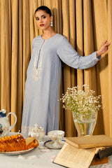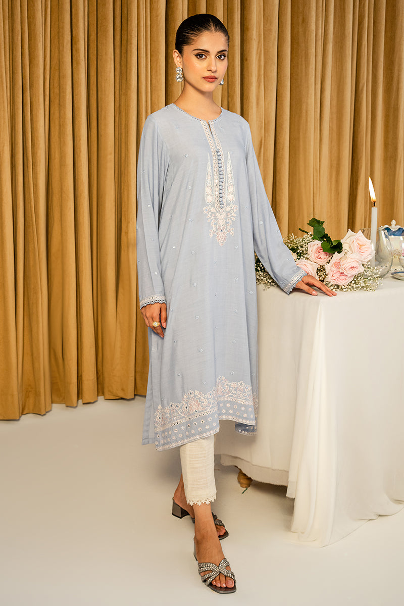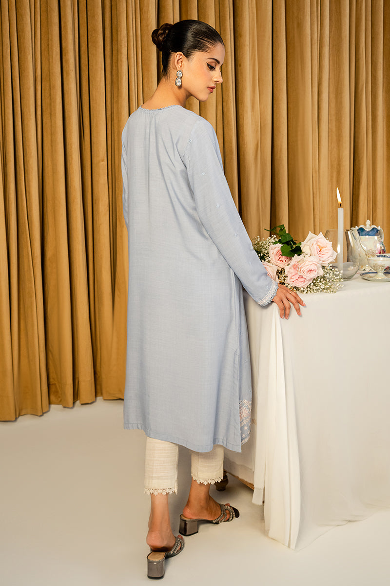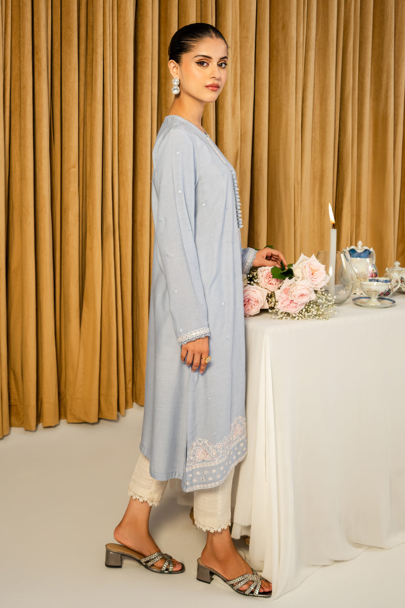 Rusty Buff's Style Strait Shirt is made from Khaddar fabric, with a band neck accented with buttons. The front of the shirt features embroidery, while the back is plain dyed. The sleeves are detailed with embroidery and lace, and it comes with a staple woolen embroidered dupatta. This classic shirt is perfect for any occasion.