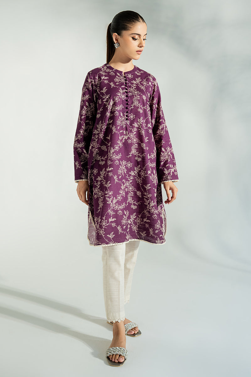 - This BELL FLOWER-PRINTED SHIRT is a stylish straight shirt with round hem, crafted from khaddar fabric. It features a band collar with loop button detail, and is decorated with striking floral print and lace detail on the front and back and sleeves. An elegant and eye-catching piece for any wardrobe.
