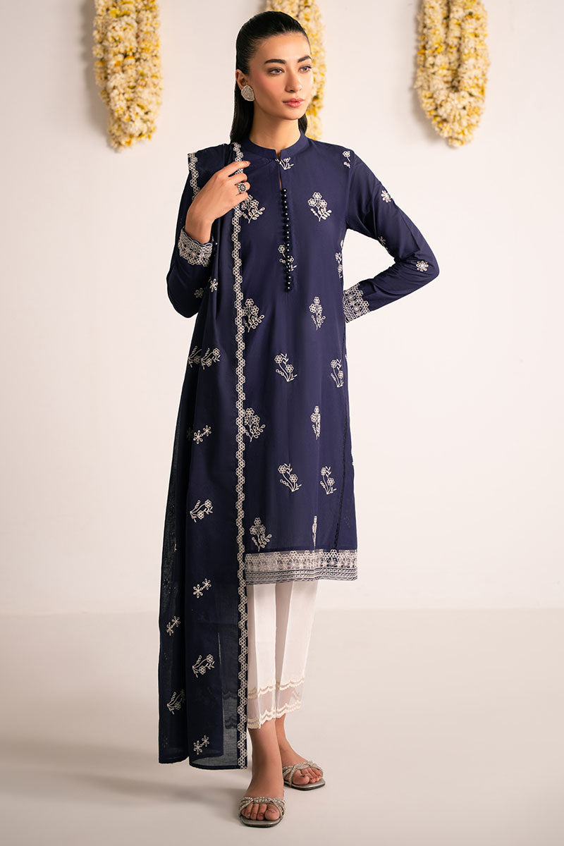 - Expertly crafted A-line panelled shirt featuring front dyed embroidery with elegant lace insertion. Designed with a sophisticated band collar, slit neckline with button detail, and fitted embroidered sleeves finished with loop buttons. Complemented by a coordinating lawn dyed and embroidered dupatta. This Blue Bliss ensemble delivers refined style with meticulous attention to detail.