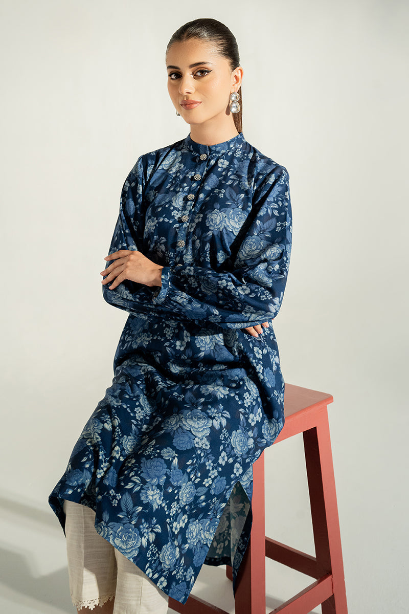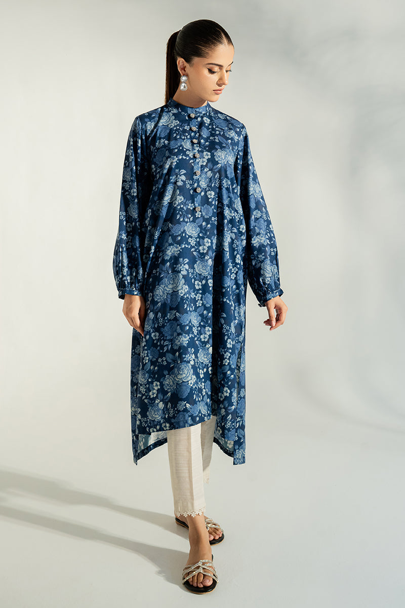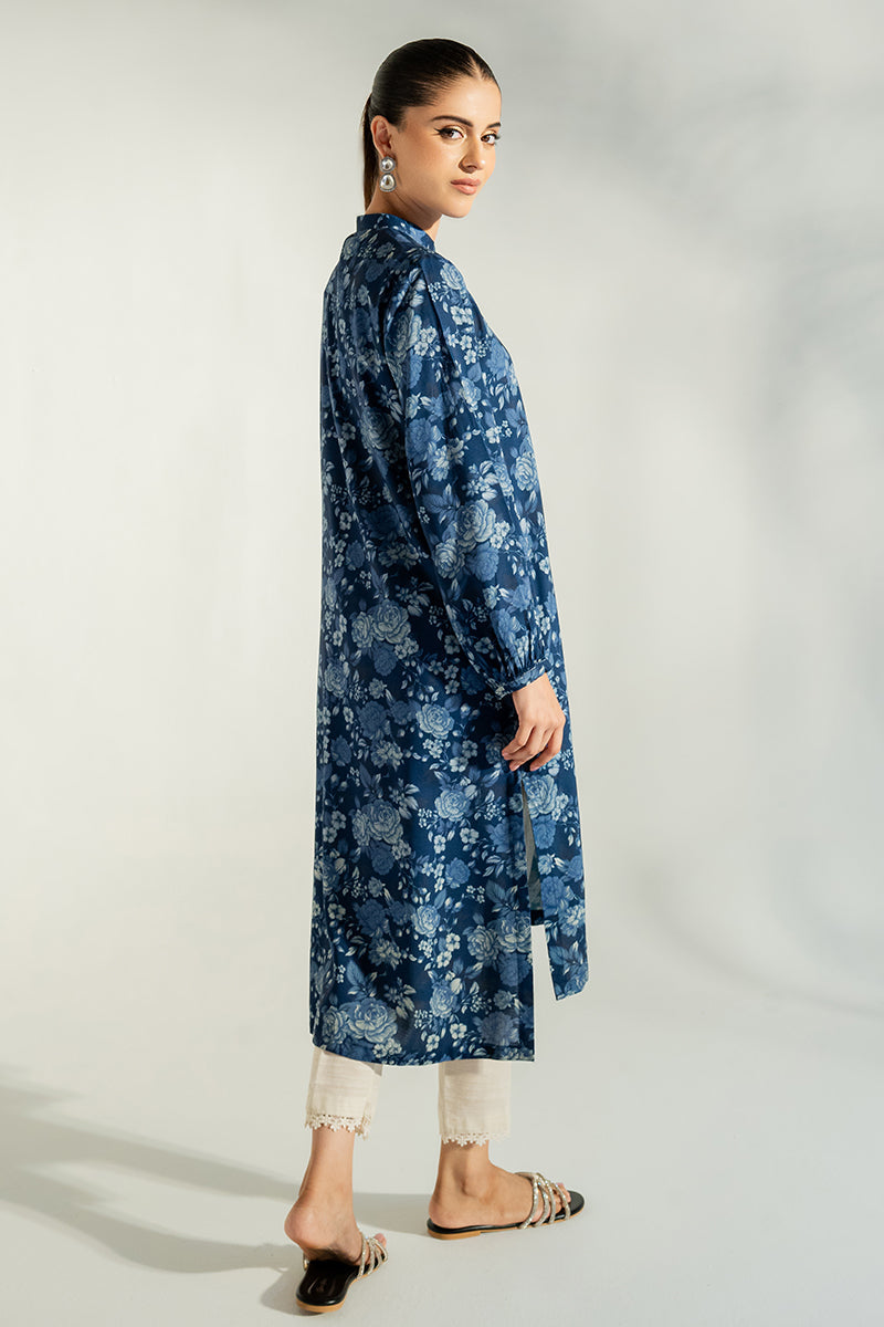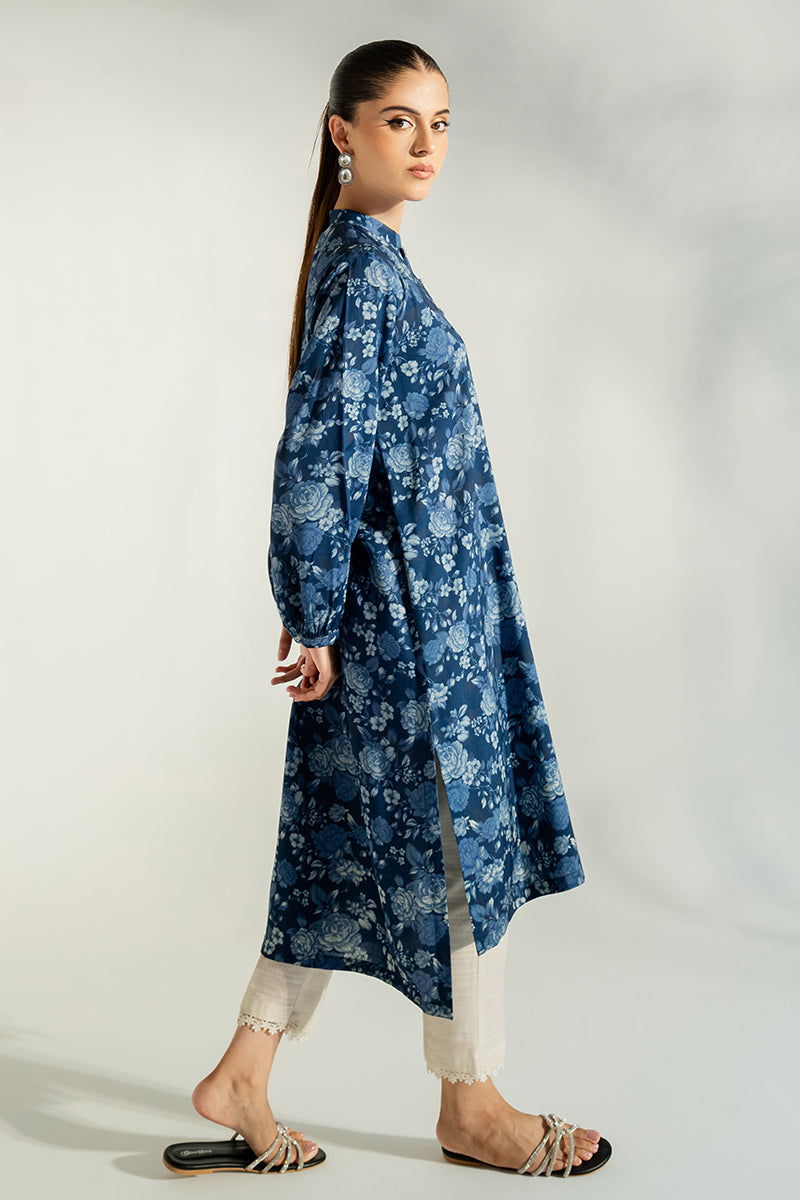 - This BLUE ORCHID-PRINTED SHIRT has a contemporary straight high/low style. Crafted from linen, it features a unique front and back print and a neckline band, detailed with embellished buttons on the placket. The sleeves are finished with a gather at the sleeve hem.