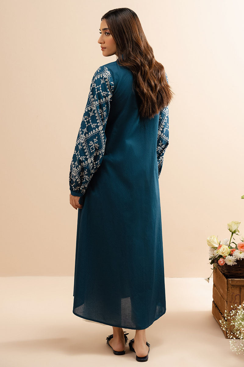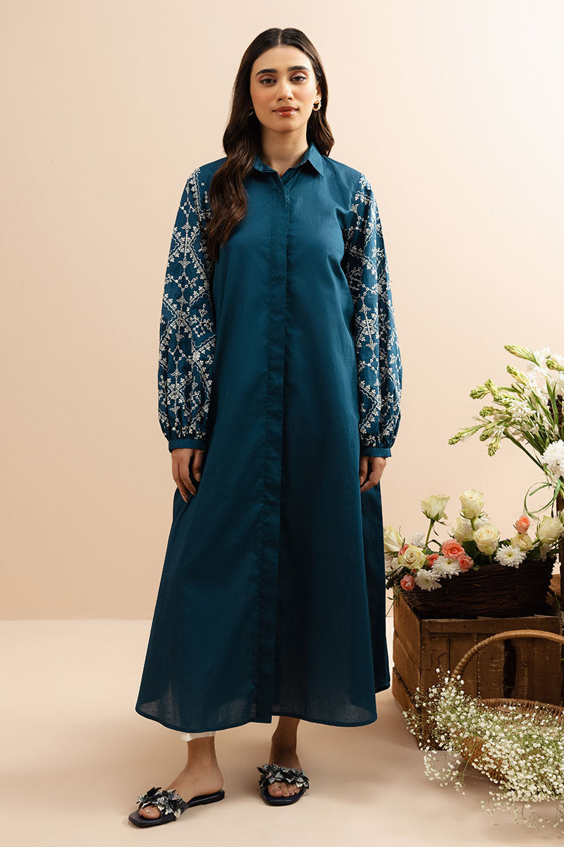 This A-line dress is made of lawn and features a front and back that are plain dyed. It has a neckline with collars and a double placket, as well as balloon-style sleeves with embroidered detailing on the shirt.