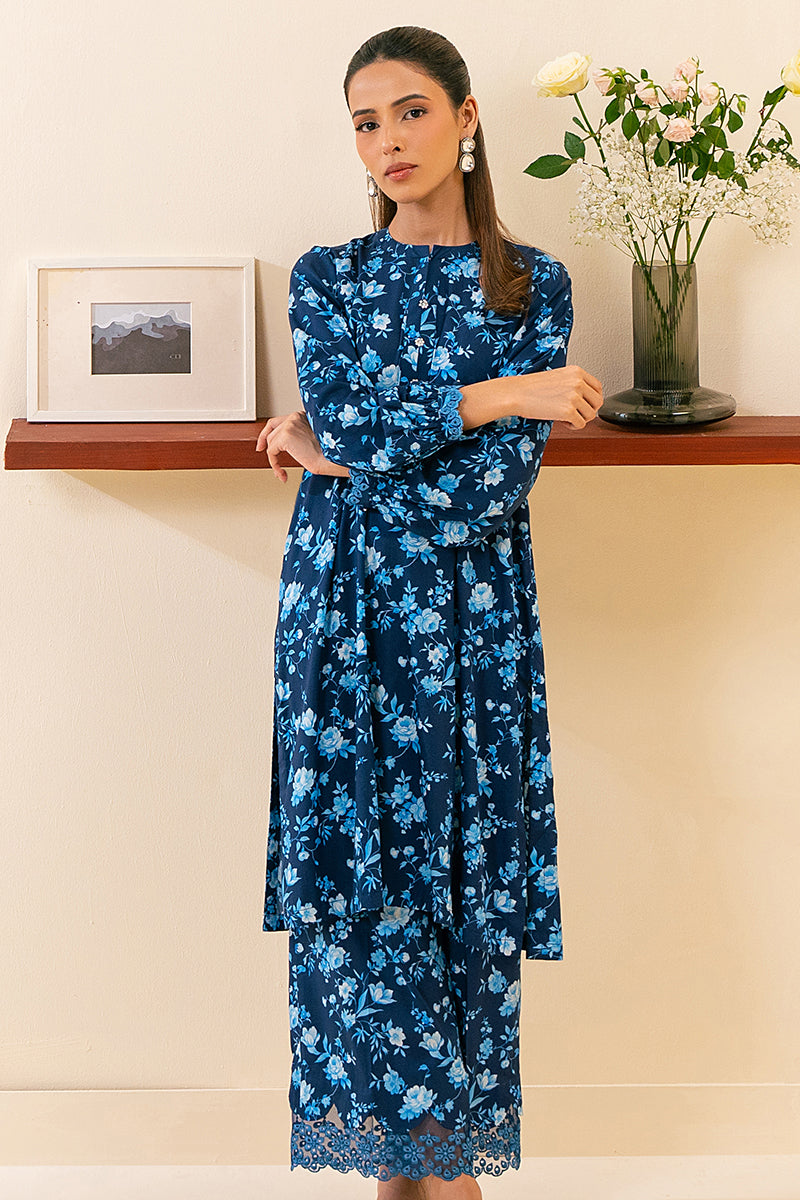 - Upgrade your wardrobe with our COBALT BLUE-2 PC set! The straight-cut linen SHIRT features a unique front and back print, pleat detail on the back, and a trendy tassel neckline. The TROUSER is a stylish culotte style, adorned with an embroidered border print for an added touch. Elevate your style with this versatile and fashionable set.