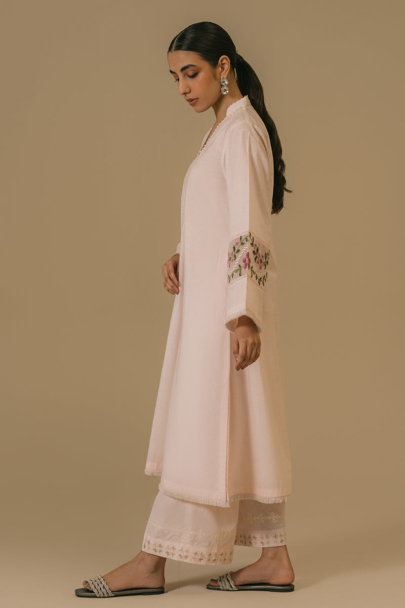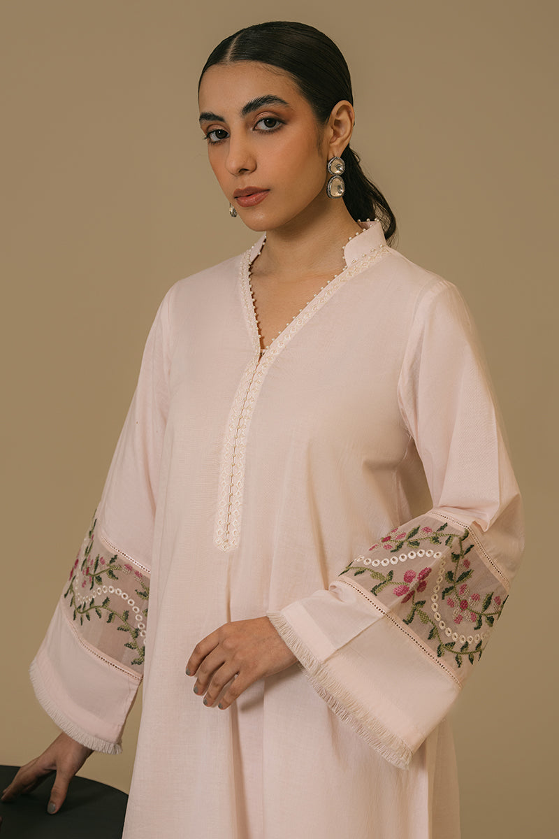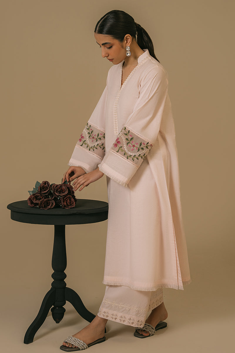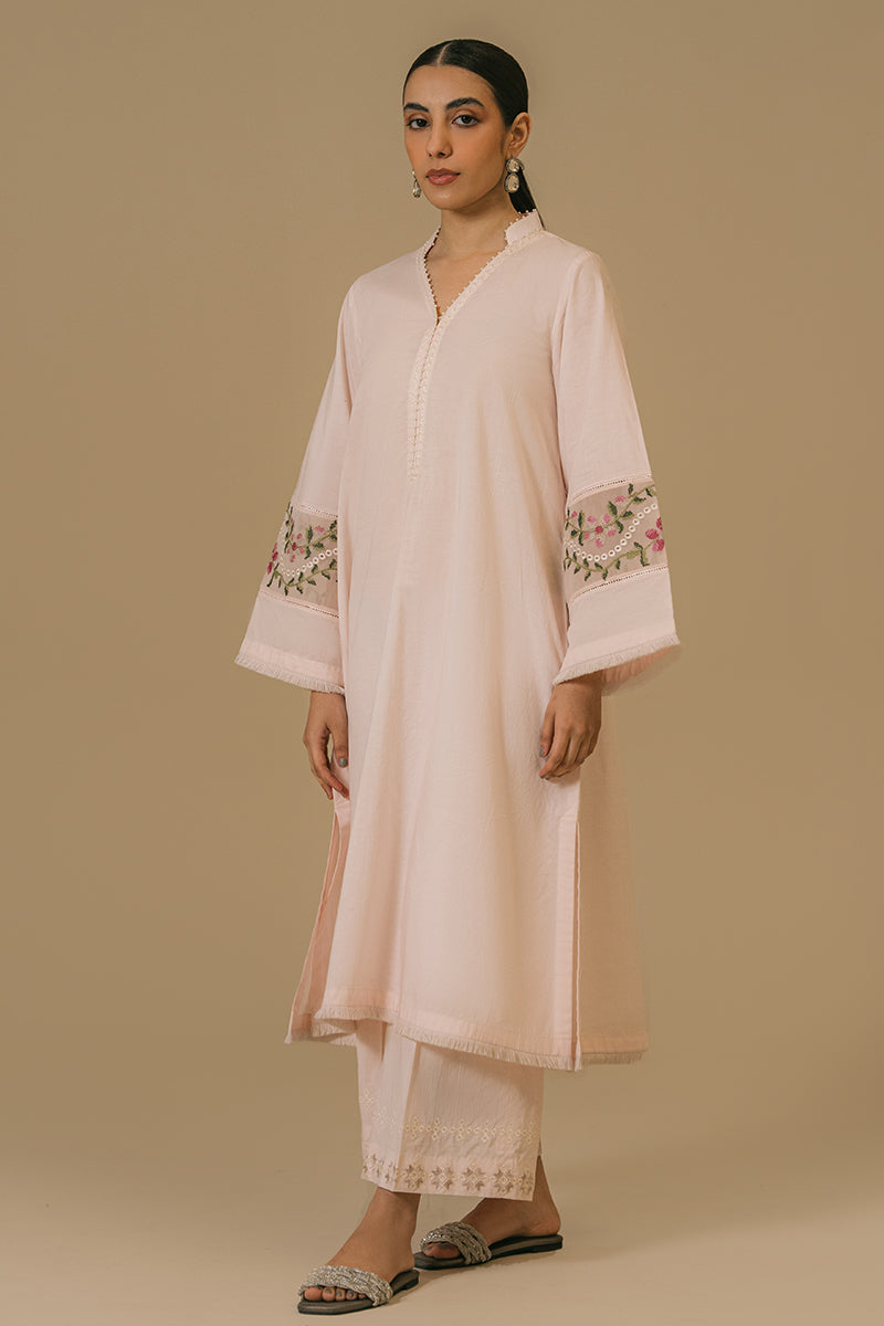 - Effortlessly stylish and comfortable, our CRADLE PINK-2 PIECE set includes a straight cambric shirt with delicate front lace embroidery and a band collar with V-neck and pearl detailing. The back is plain dyed and the sleeves are adorned with lace embroidery. Complete the look with our embroidered cambric culotte for a stunning ensemble. Upgrade your wardrobe with this elegant and versatile set.