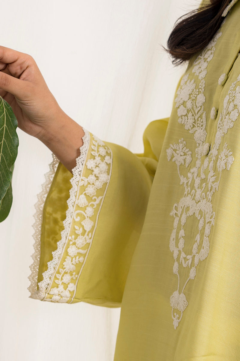 - THIS TIMELESS DRIED MOSS-2PC (SHIRT & DUPATTA) SET IS MADE FROM A LUXURIOUS COMBINATION OF RAW SILK AND SILK PRINTED FABRIC. THE SHIRT FEATURES AN ELEGANTLY PLAIN FRONT, EMBROIDERED NECKLINE, BOX PLEAT, AND EMBROIDERED SLEEVES. THE DUPATTA IS SILK PRINTED AND COMPLEMENTS THE SET WITH A BEAUTIFUL FINISH. PERFECT FOR A SPECIAL OCCASION.