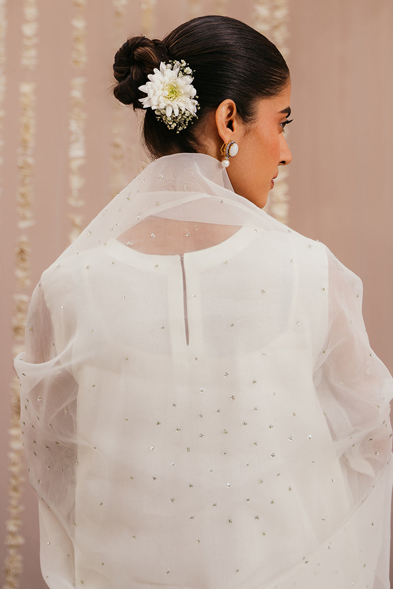- Expertly crafted with an A-line silhouette, the EAST AURA 2 PIECE SHIRT & DUPATTA boasts of organza fabric and intricate embroidery. The keyhole neckline and pearl adorned sleeves add a touch of elegance, while the plain dyed back keeps it simple. Paired with an exquisite organza dupatta, this set is a must-have for any occasion.