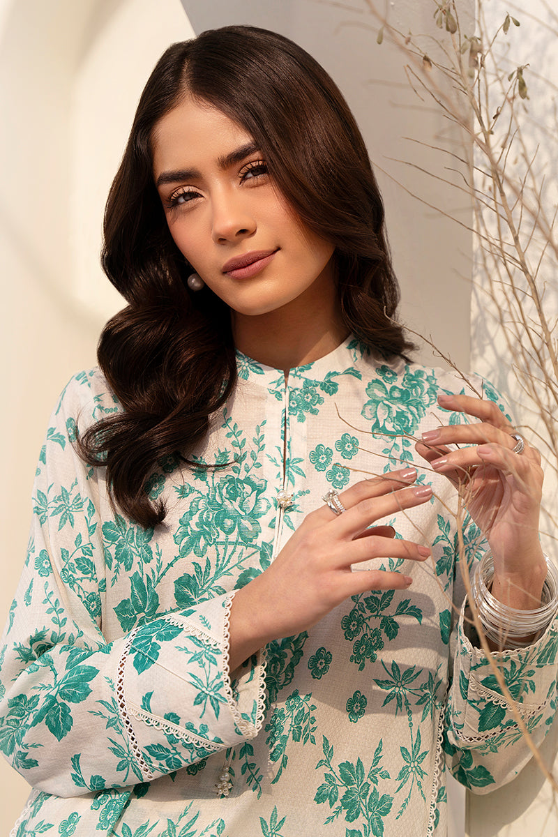 - Elevate your wardrobe with our EMERALD GALORE-2 PIECE set, featuring an a-line panelled shirt and dobby lawn printed shalwar. The neckline is adorned with dori piping and pearl detail, while the sleeves boast lace and pin tucks. Stay on-trend with the front and back print.