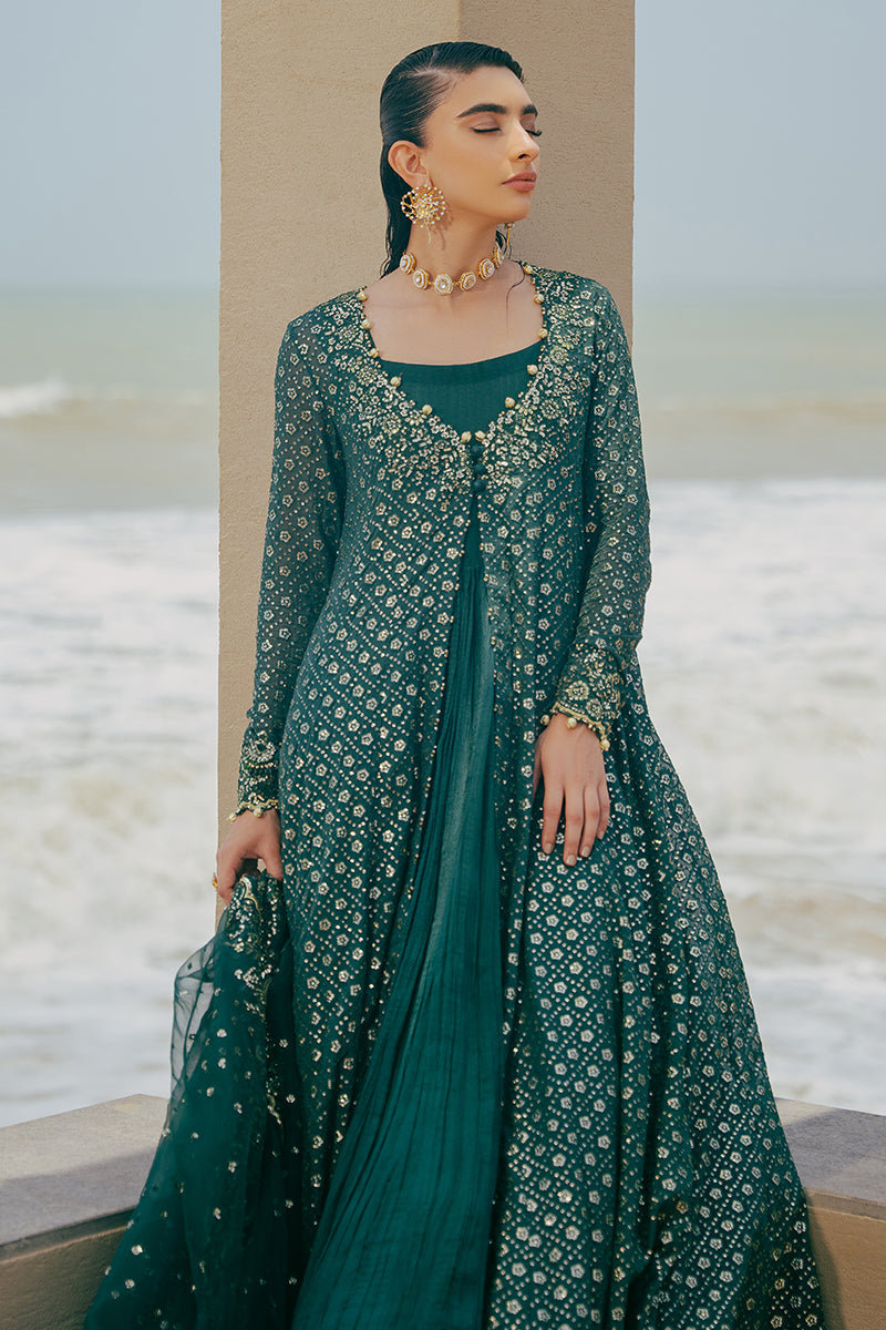 Indulge in luxury with our Green Spring 3-piece embroidered gown. The paneled front and sequin embroidery on the shirt exude elegance. The open jacket adds a touch of sophistication, with a crushed silk inner gown for ultimate comfort. The embroidered and embellished neckline and fitted sleeves with tassel detail complete the look. Complete it with the poly organza embroidered dupatta for a perfect finishing touch.