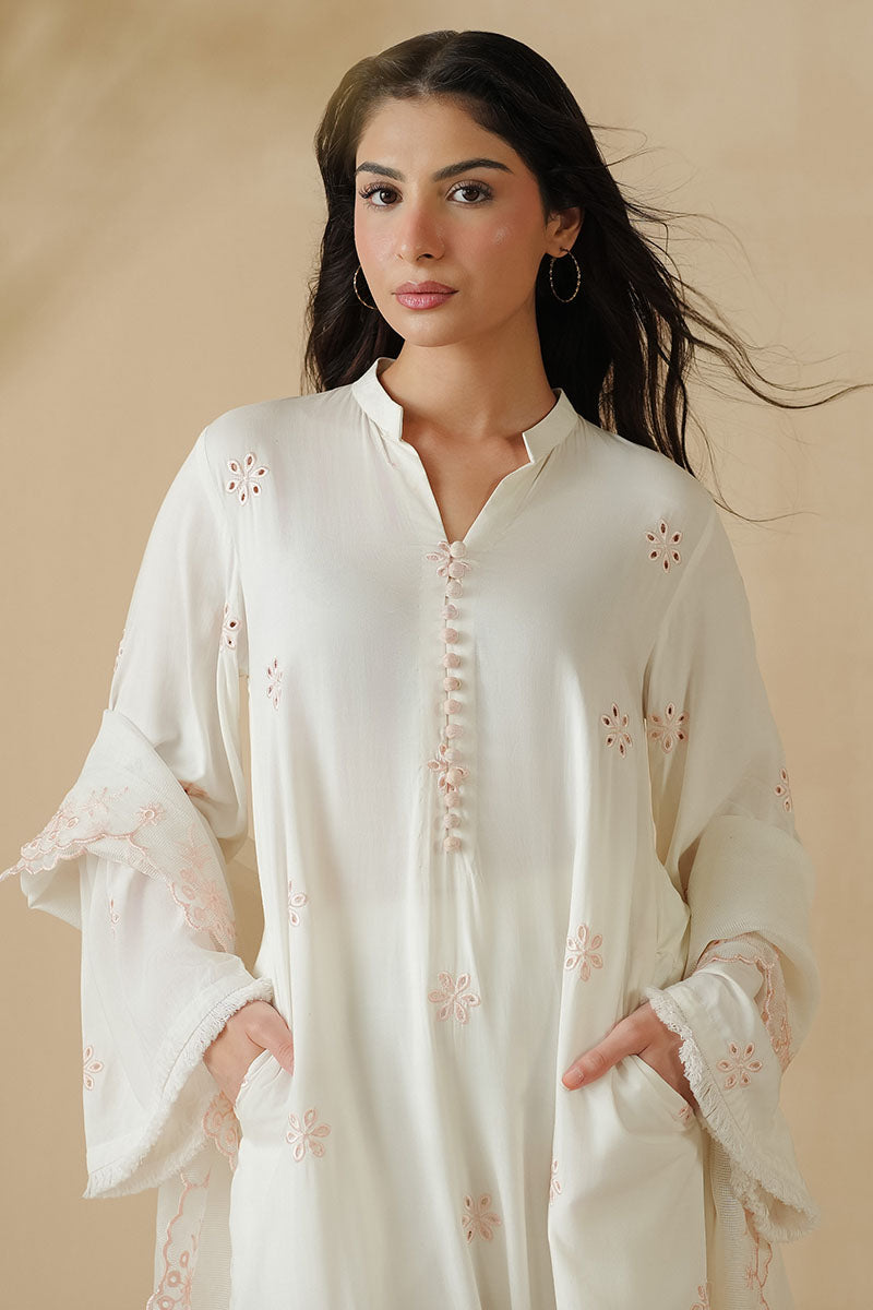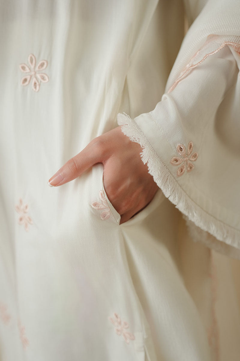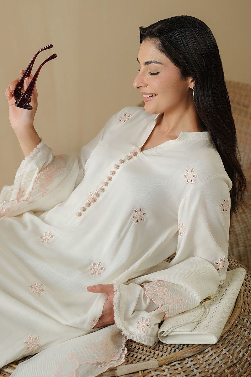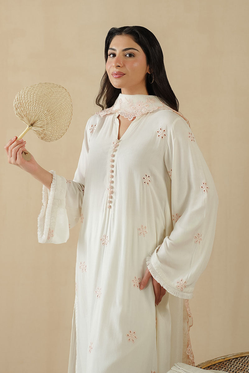 - This Island Escape 2PC set features a straight-cut blended lawn shirt with intricate front embroidery and a plain dyed back for a balanced look. The half-band neckline with loop buttons adds subtle elegance, complemented by flared sleeves finished with delicate fray lace. Accompanied by a Rajjo net embroidered dupatta, this ensemble blends refined craftsmanship with comfort, perfect for a sophisticated and stylish appearance.