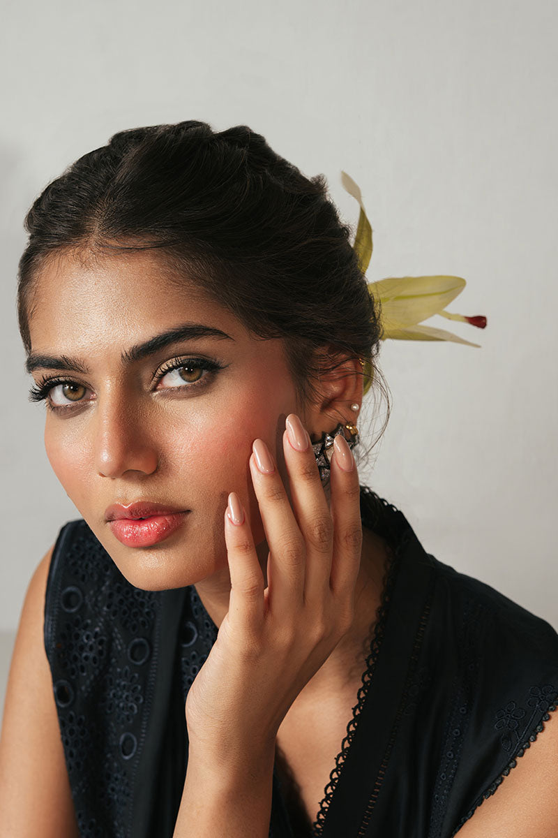 This exquisite three-piece set features a shirt crafted from luxurious chikankari lawn fabric with delicate embroidery on the front and sleeves, complemented by a dyed back and 40 embroidered patti for added elegance. The trouser is made from soft, dyed cambric, ensuring comfort and durability. Completing the ensemble is a beautifully embroidered lawn chikankari dupatta, providing a graceful and traditional finish to the Midnight Glam collection. Perfect for sophisticated occasions, this set combines intricate craftsmanship with breathable fabrics.