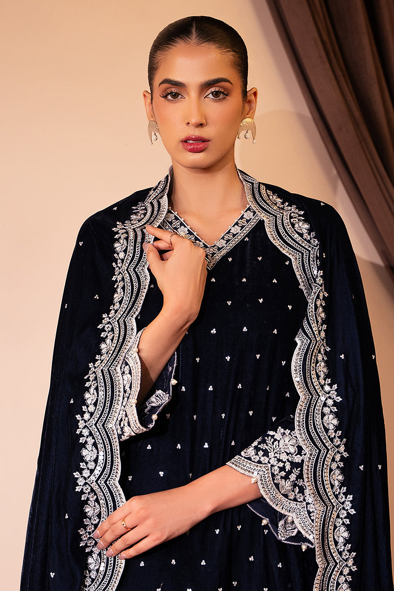 This 3-piece set features a straight velvet shirt with embroidered sequin details on the front and back. With a V-neckline and pearl detailing, the shirt also has embroidered sleeves with scallop and pearl accents. The culottes silk trousers and velvet dupatta with sequin and cutwork details complete the elegant and luxurious look.