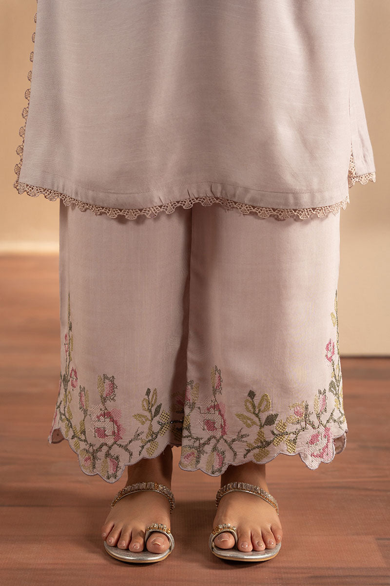 - This Orchid Tint 2-piece set features a straight-cut shirt with a front dyed lace hem and an embroidered patch on the back, complemented by a band collar with lace and tassel accents. The regular sleeves are detailed with embroidery and tassels, adding refined texture. Paired with silk-dyed culottes, this ensemble combines elegant craftsmanship with comfortable, breathable fabrics for a sophisticated yet effortless look.