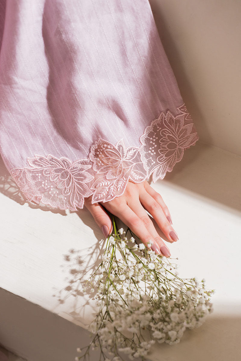 - This Peach Blush 2PC set features an A-line flared shirt in a solid-dyed fabric with a band collar and a keyhole neckline, offering a refined silhouette. The sleeves are enhanced with delicate embroidery for subtle elegance. Complementing the shirt is a Rajjo net dupatta adorned with matching embroidery, adding a graceful and sophisticated touch to the ensemble.