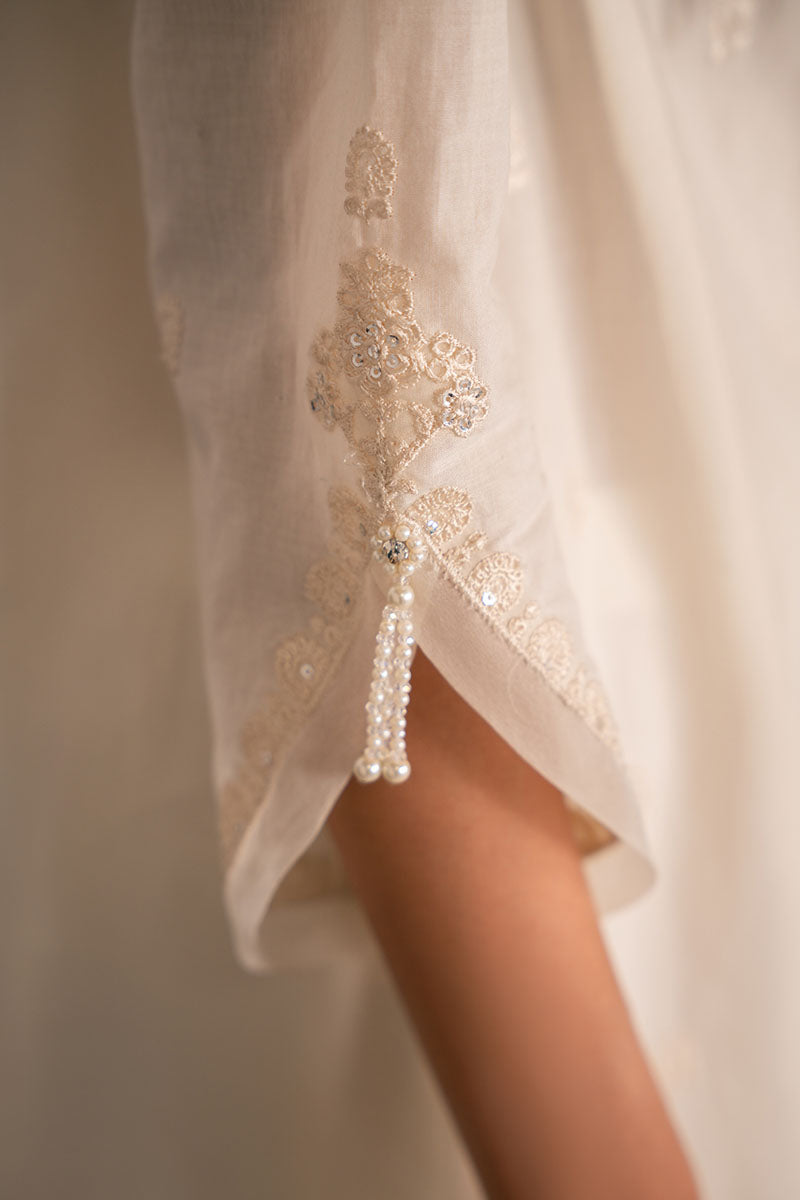 - Introducing the PEARL ALLURE-2PC, a stunning set featuring a beautifully embroidered A-line shirt with a round neck adorned with delicate pearls. The sleeves are designed with intricate embroidery and extended organza, finished with elegant tassels. The cotton net embroidered dupatta adds the perfect finishing touch. Elevate your style with this timeless ensemble.