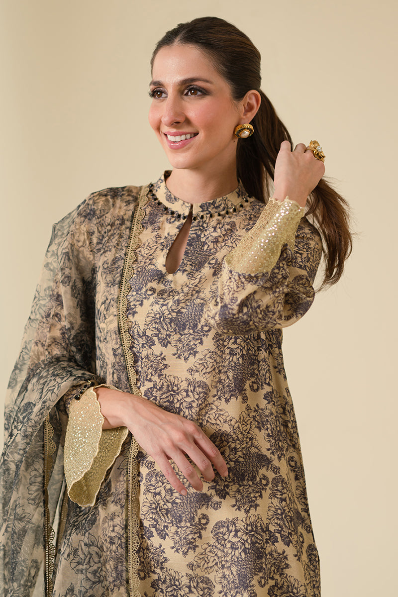 STYLE TIP - Introducing our PRAIRIE SAND-2PC set. The silk straight shirt features a unique band collar with a keyhole opening and printed sleeves with an embroidered border. The back of the shirt is also printed, while the matching organza dupatta adds a touch of elegance with its print. Authentically modern, sophisticated, and chic.