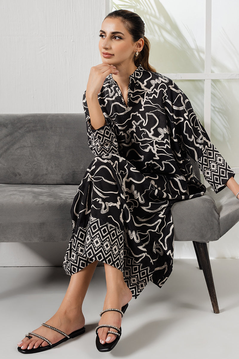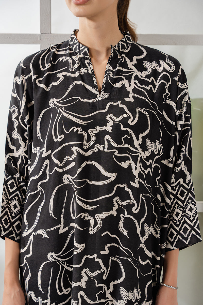 Elevate your wardrobe with our Raven Haze silk printed shirt. Featuring a batwing kaftan style and front and back prints, this shirt exudes effortless elegance. With a slit neckline band and printed sleeves, it's the perfect blend of comfort and style. Upgrade to luxury with 100% pure silk.