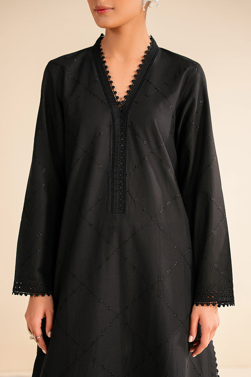 - Expertly crafted with a straight cambric style, this Raven Shadow Chikankari Shirt features intricate front embroidery and a sleek, plain dyed back. The wrap-around neck with lace detail adds a touch of elegance, while the straight embroidered sleeves complete the look with a touch of sophistication.