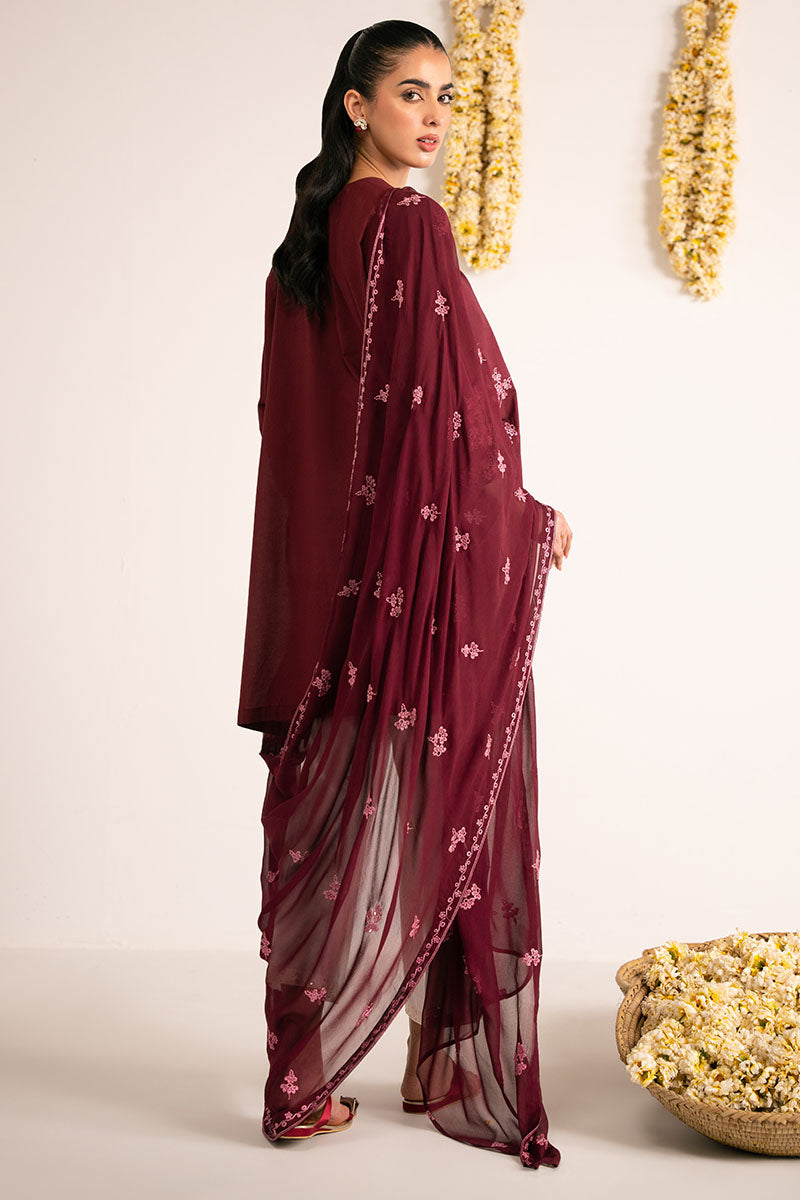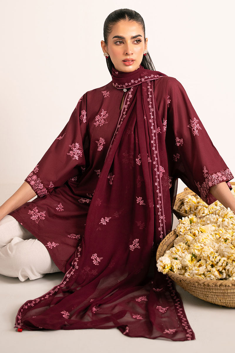- Expertly crafted ROSE GLAM 2PC ensemble featuring a sophisticated batwing shirt with front embroidery and all-over dyeing. The crew neck is elegantly detailed with a keyhole button closure. Complemented by a luxurious chiffon dupatta with coordinating dye treatment and intricate embroidery, creating a harmonious and refined look.