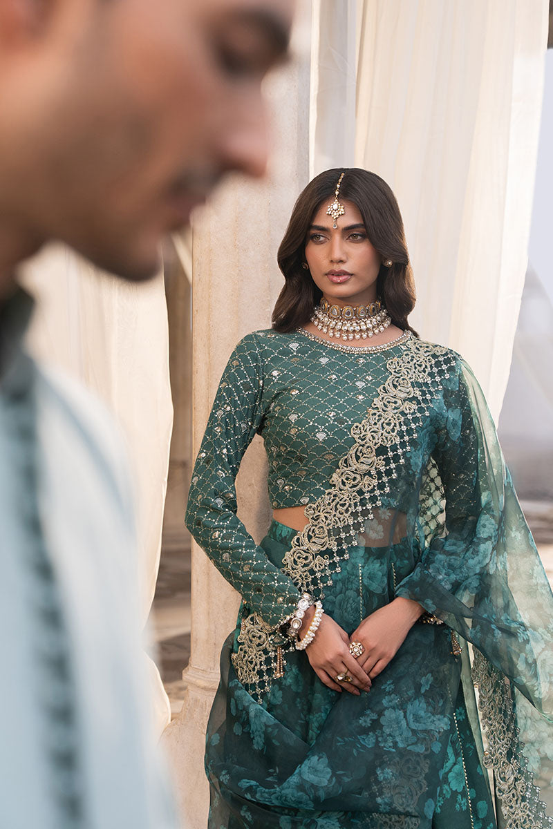 - Elevate your wardrobe with this exquisite three-piece ensemble crafted from premium silk. The choli features a front dyed with intricate embroidery, while the back showcases detailed embroidered work with an elegant keyhole opening. A crew neck adorned with adda work frames the neckline, complemented by embroidered sleeves finished with delicate tasseling details. The silk printed lehnga boasts an embroidered hem for added sophistication. Complete the look with the poly organza printed dupatta, intricately embroidered to coordinate seamlessly. Perfect for celebrations and special occasions, this collection merges traditional craftsmanship with contemporary design sensibilities.