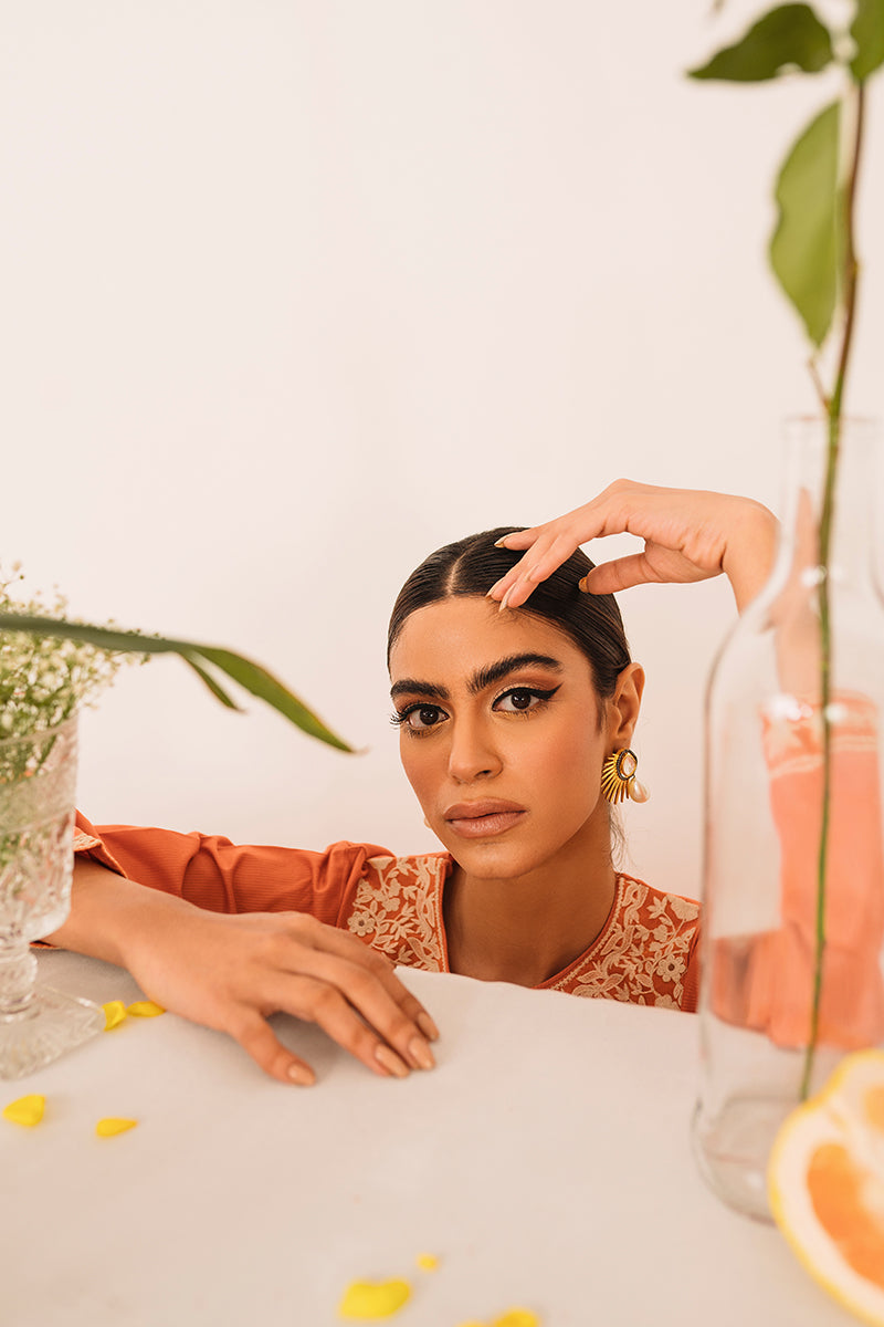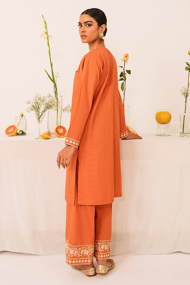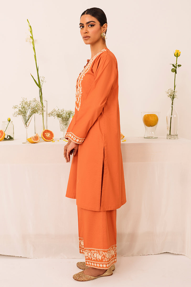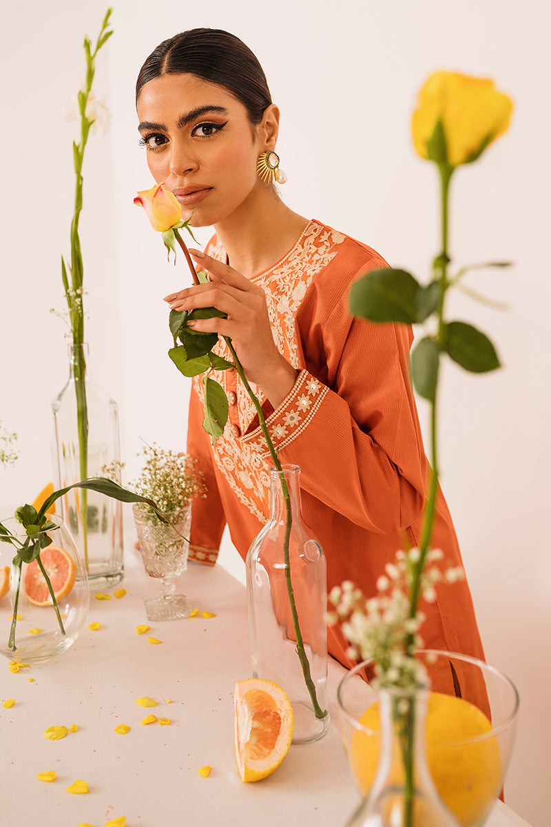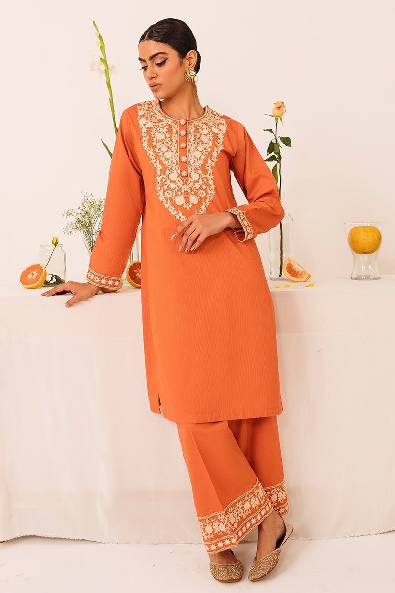 - Put your best foot forward in this classic yet contemporary textured lawn two-piece rendered on a carrot orange base. embellished and embroidered with sequins and threadwork on the kurta and wide legged pants, the enticing two-piece styles best with classic khussas and a sleek bun.