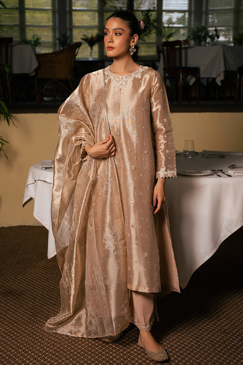 - Elevate your style with our SUNSET BLUSH-3 PC set. The straight shirt features intricate zari work and embellished tassels, while the round neck is adorned with pearl detailing. The dupatta boasts stunning zari embroidery, and the culottes silk trouser completes the look with its elegant embroidery.