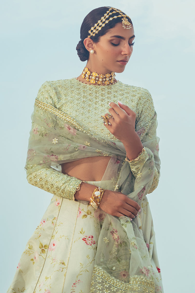 This 3-piece silk embroidered ensemble exudes elegance and comfort with its tranquil haze design. The choli features delicate sequin and embroidered detailing on the front and back, complemented by a small neck and full embroidered sleeves. The printed silk lehenga adds a touch of sophistication, while the organza dupatta showcases a beautiful blend of print and embroidery.