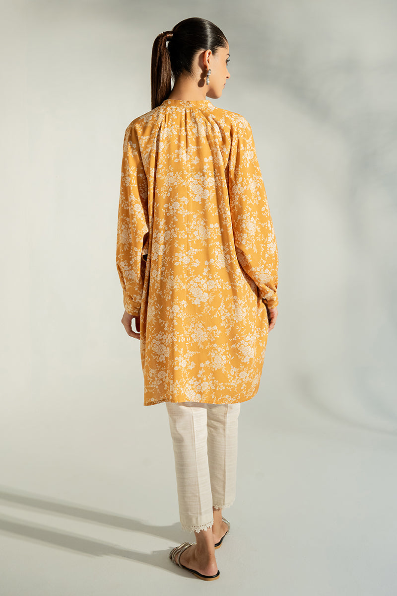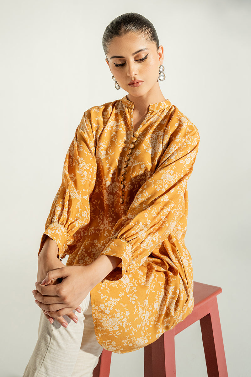 - This TUSCAN YELLOW-PRINTED SHIRT is a perfect choice for those who want a casual style with classic elements. It is made of linen fabric and features a loose fit, front print, neckline band, and batwing/raglan sleeves for a stylish look. Perfect for everyday wear.
