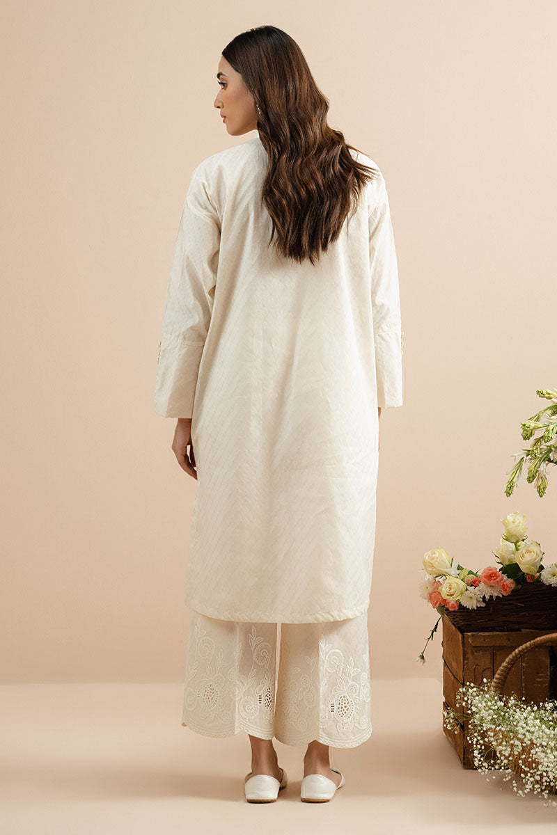 This piece includes a straight shirt with a drop shoulder and textured cotton, as well as a half band neckline with placket and button detail. The straight sleeves feature cuff detail. The trousers are made of textured cotton and are plain dyed with embroidered borders, adding a touch of elegance to the overall design.