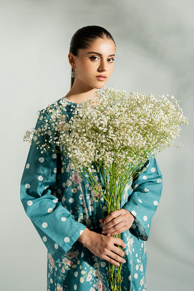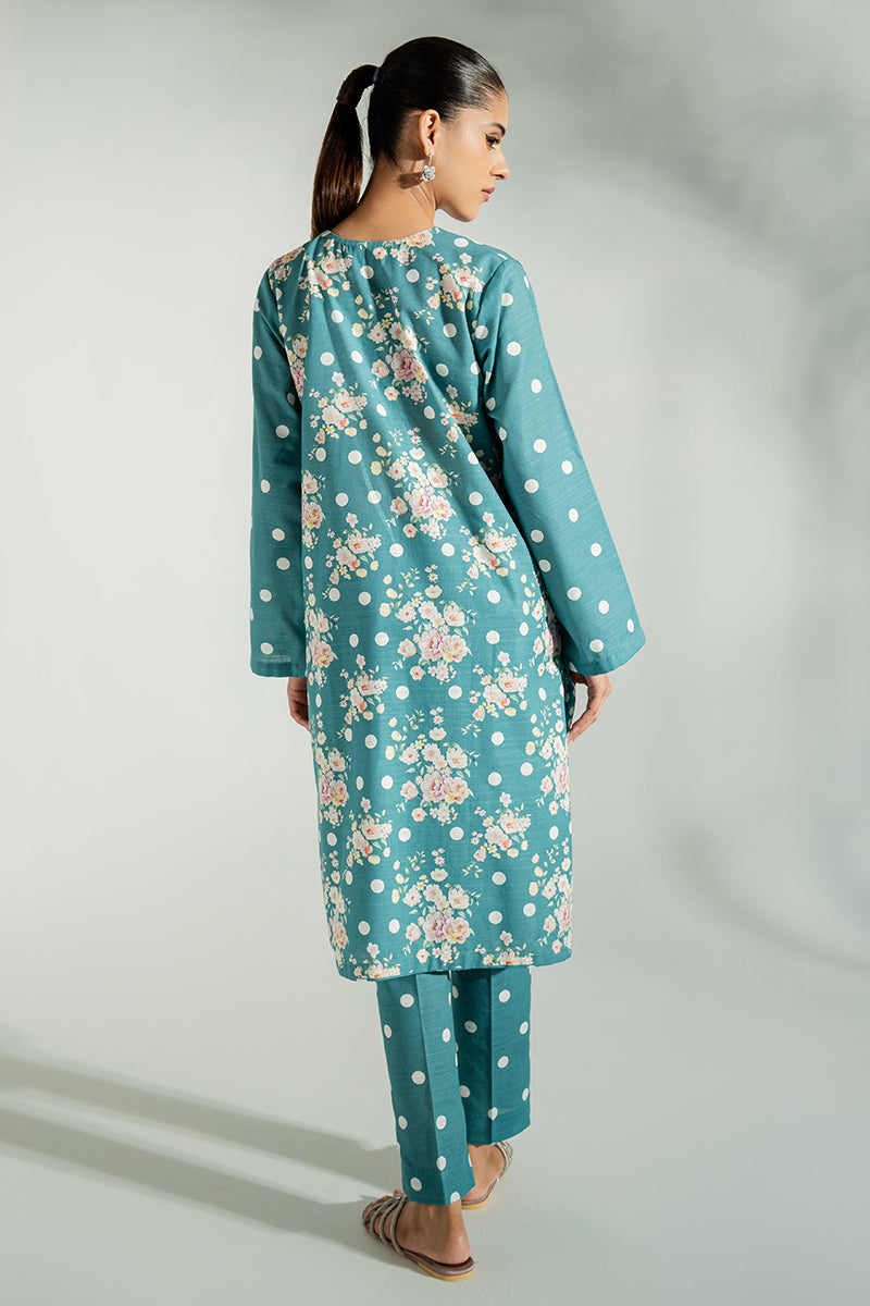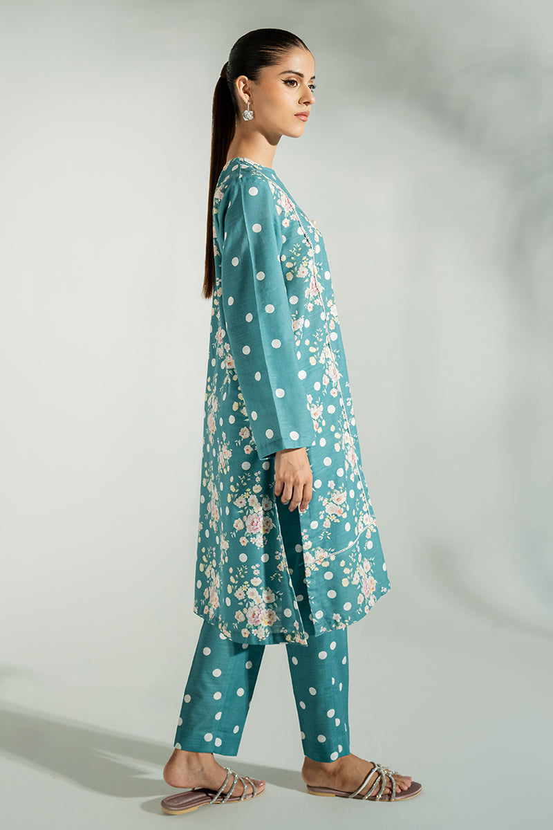 - Introducing BLAZING BLUE - a stylish straight-cut shirt and khaddar cigarette pants set. This ensemble features a round neckline with V-placket opening and matching buttons, a printed lace on the front, and a printed back. Our khaddar fabric ensures durability and comfort. Make a fashion statement with this timeless design.